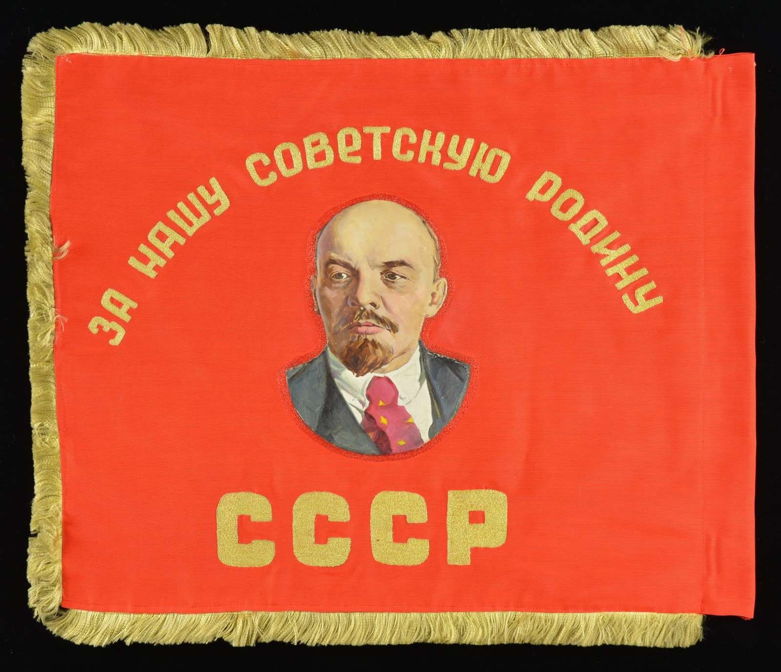 19x25" Two sided flag with gold embroidered lettering and finely painted portrait of Lenin below patriotic motto, sleeve hoist with gold fringe. The reverse with motto that translates: "Death to German Invaders" with unit designation "89th Artillery". CONDITION: good very good overall, fringe color faded. (02-18038-32/JS). $200-300.