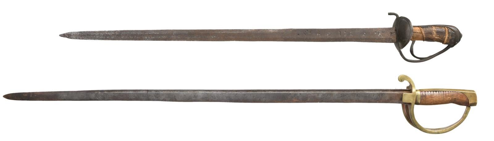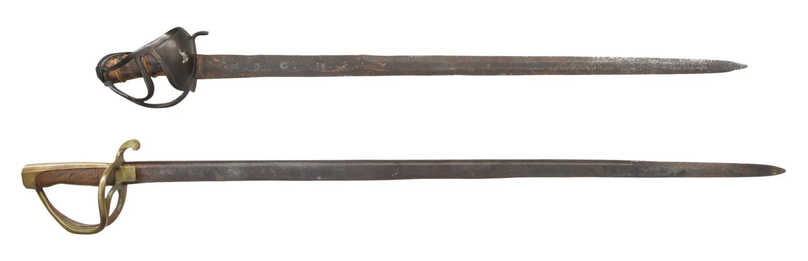 1) Overall length: 38 1/2". Blade length: 33 1/4". Blade has a single narrow fuller near the spine and is deeply stamped "POP EL REY CARLOS III." on one side and "DRAGONES. T. 1769" on the other. Heavy brass hilt with 2 branch guard, drop quillon and square languets. Plain modified octagonal pommel with a 3 sided backstrap. Plain wood grip with worn evidence of horizontal ribbing. No scabbard. It is quite likely this is an earlier blade rehilted in the early 19th century. CONDITION: blade has a dark patina. Hilt is quite solid & undamaged with some evidence of verdigris & red paint. Grip is heavily worn but likely original. 2) Overall length: 33 1/4". Blade length: 27 1/2". Blade does not have a fuller but seems to have a 19" false edge on the spine. The blade is stamped "Y. Io. 1795(dots)" on one side, and "C (3 dots) IV (dots) (crowned) R" on the other. Brass semi-basket guard with a bird's head type pommel and plain backstrap. The grip is leather wrapped wood with 4 strands of cord. No scabbard. CONDITION: blade has a dark, pitted patina. Hilt shows some damage with a heavy patina. Only traces of leather and some of the cord remains on the grip. PROVENANCE: From the Collection of James B. Taylor. (02-19884/BF). $700-1,100.