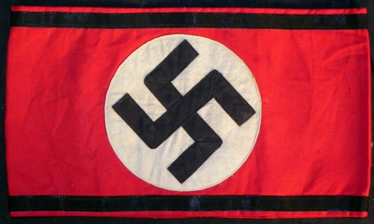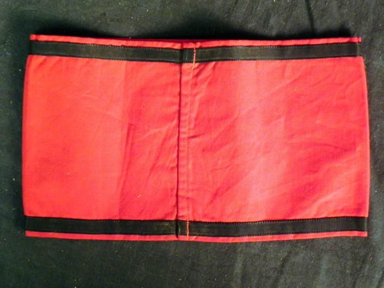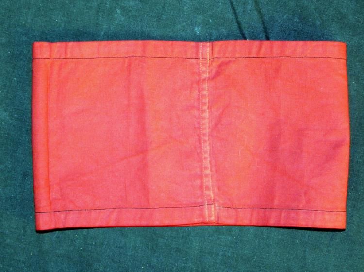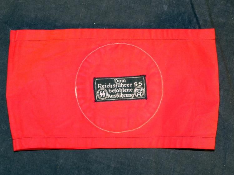EARLY SS ARMBAND WITH CLOTH RZM TAG-MULTI-PC---GREAT CONDITION ON THIS RARE SS ORIGINAL ARMBAND--RED COTTON BODY RETAINS COLOR--TOP & BOTTOM HAVE BLACK SATIN APPLIED STRIPS OF BLACK RIBBED MATERIAL WHITE CIRCLE WITH BLACK MULTI-PIECE SWASTIKA--ARMBAND IS SEWN TOGETHER IN BACK--INSIDE HAS CLOTH RZM TAG SEWN IN--READS "REICHSFUHRER SS BEFOHLENE AUSFUHRUNG" WITH SS AND RZM ON THE SIDES.