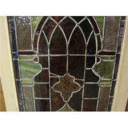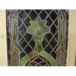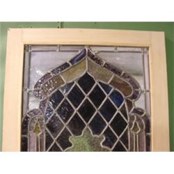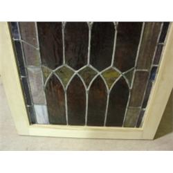 EARLY STAINED GLASS WINDOW. Has been reframed with pine framing. 80" H, 28.5" W framed. 74" H, 22.25" W unframed.