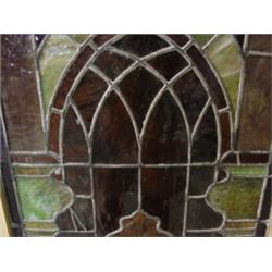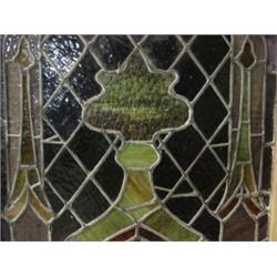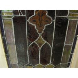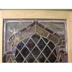 EARLY STAINED GLASS WINDOW. Has been reframed with pine framing. 80" H, 28.5" W framed. 74" H, 22.25" W unframed.