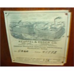 EARLY SURVEYING TRANSIT WITH CASE. Marked with label on bottom of lid "Keuffel & Esser Co.-No. 506-Serial 47773". Case shows signs of wear and aging. Transit shows minor signs of wear and loss to paint. Includes oak tripod marked "251227". Case: 15" H, 12.25" W, 8.5" D. Tripod: 58" H