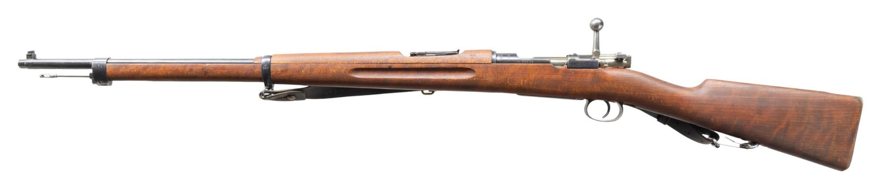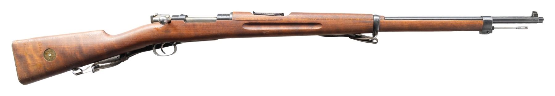 Cal. 6.5x55. S# 43336. Bbl. 29" with Century import marking. Blade front sight. Ladder rear sight graduated to 2000m. All visible matching numbers with some parts possibly arsenal force matched. Receiver ring has Mauser Oberndorf markings with 1900 date. Arsenal blue finish. Beech stock set with bottom mounted sling swivels & leather sling. Stock disc has a triangle over "2" for bore condition. Underside of wrist has two Swedish crown markings. Unnumbered cleaning rod present. CONDITION: stock set has some paint splatter remnants on butt, scattered dings, worn finish & handling marks. Metal retains 85% arsenal rework blue with some light scratches on bottom metal,scattered thinning, fading & edge wear. Action functions properly when hand cycled. Very good bore with strong rifling. (25-2740/MJC). CURIO. $350-500.