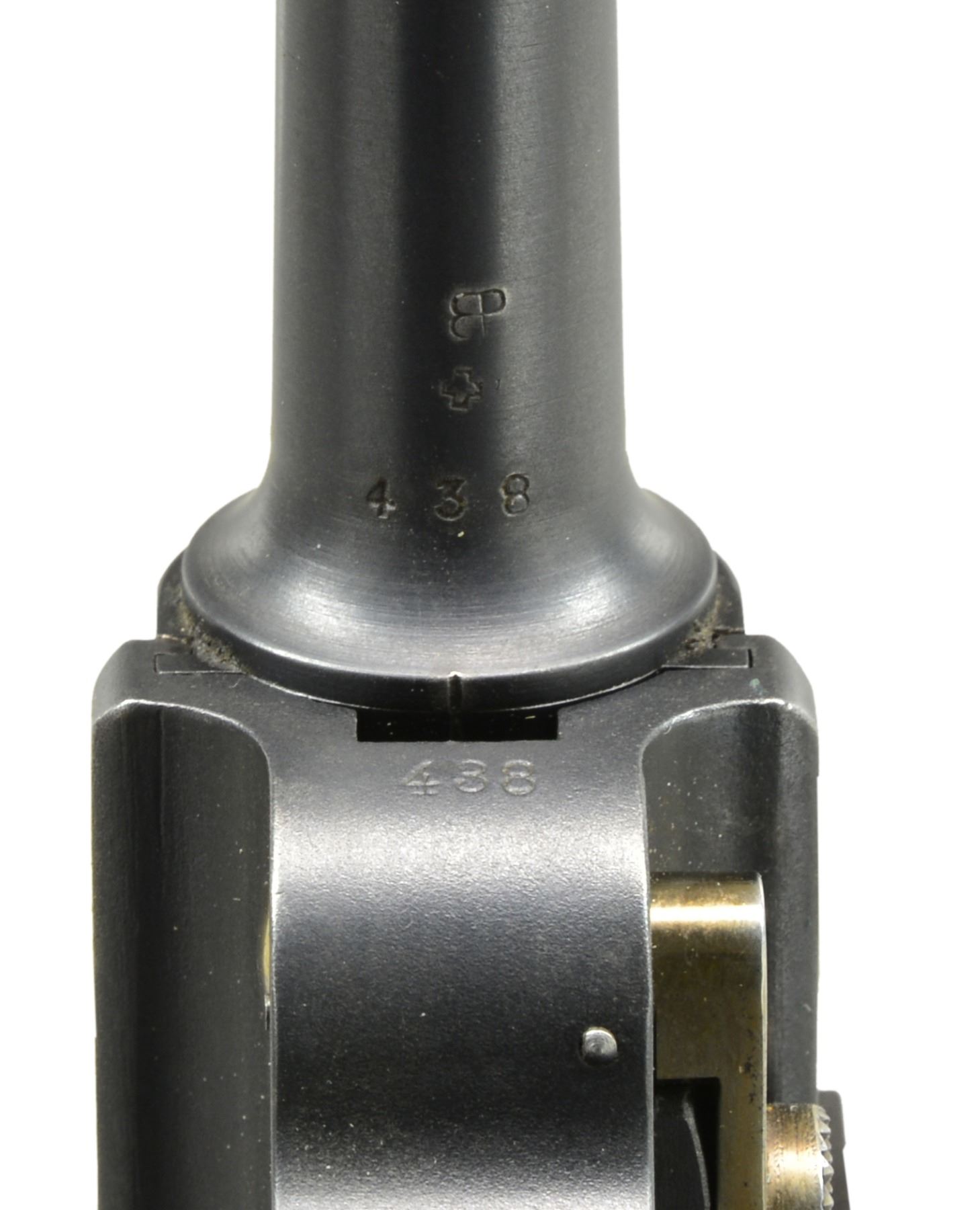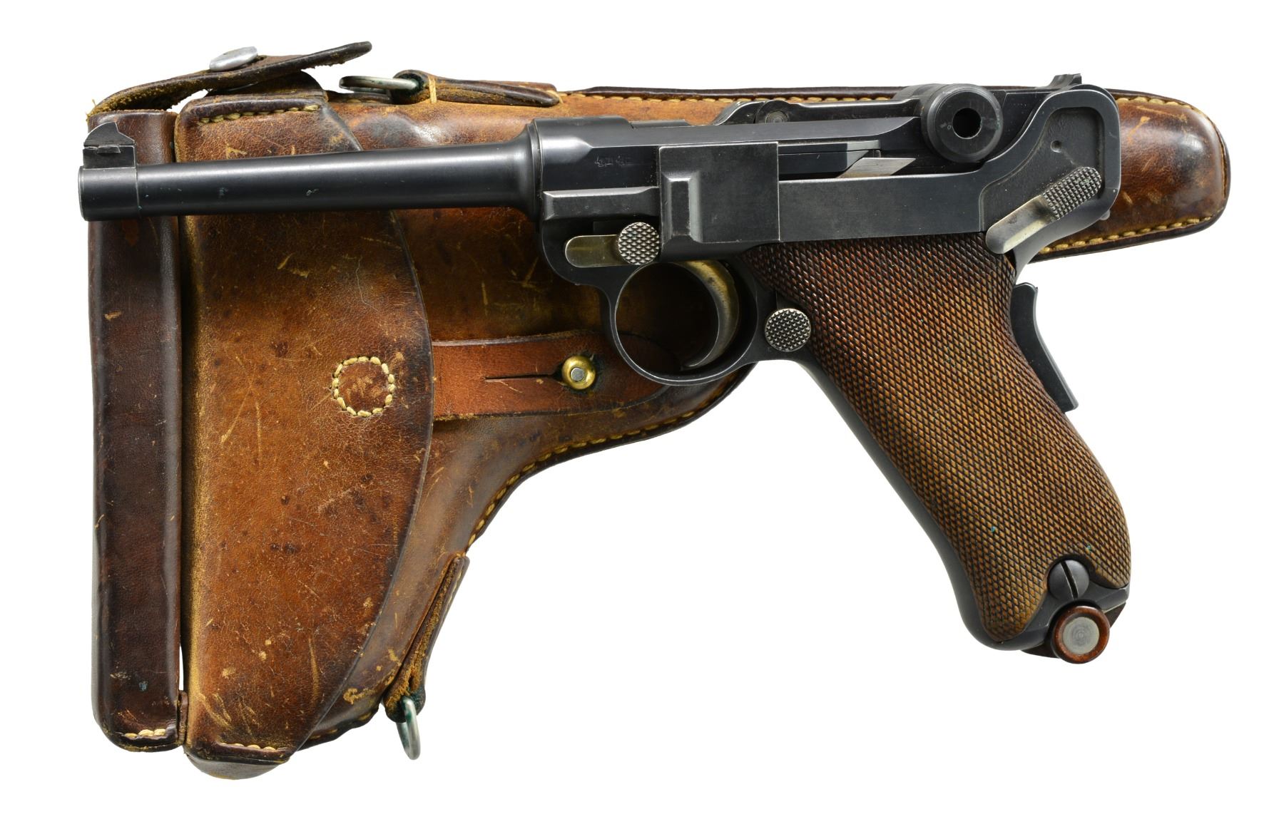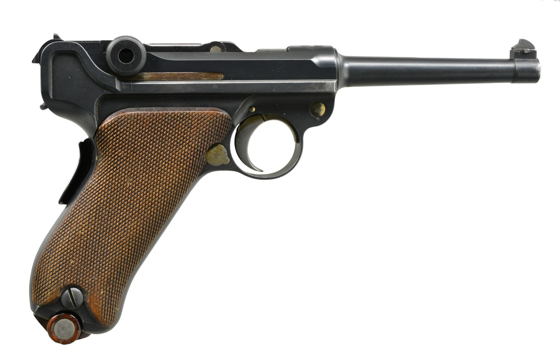 HOLSTER. Cal. 7.65mm Luger. S# 438. A very early Swiss 1900 Commercial Luger, with original, unaltered frame for flat magazine button, reworked and now fitted with a 1929 Bern-type toggle train. The pistol started as a standard configuration M1900 with 4.75" barrel, drift adjustable front sight, narrow trigger and narrow safety. Swiss Cross over chamber. DWM on middle link. Large, first variation checkered safety. Full SN under barrel and forward frame, last two digits on many of the small parts. BU commercial proofs left side of receiver and middle toggle link. At some point the gun was reworked, possibly at Bern, now with a replaced toggle train. The updated breechblock is proofed but unnumbered, the middle link is numbered "31", and the last link, unnumbered, is from a 1929 Bern. Sideplate is unnumbered. The frame was updated to have a coil recoil spring. The left grip is matching; the right grip proofed but unnumbered. MAGS: near excellent original, complete with scarce, early military flat button. UNATTACHED ACCESSORIES: later military holster, added pouch, dated "16". VG+ holster with supple leather and intact, original stitching. CONDITION: approximately 98-99% arsenal blue as reworked with revised toggle train and several unnumbered, updated parts as mentioned. Discreetly import marked using a fine laser etching method in an unobtrusive area. The left grip is missing a tiny chip under the safety. Bright, near-mirror bore, perfect manual mechanics. An interesting Luger, combining many of the earliest and most desirable features of the M1900 Luger with some of Bern"s latest designs. PROVENANCE: From the esteemed collection of Paul Regnier, Switzerland. (20-1421/LA). CURIO. $2,500-4,500.