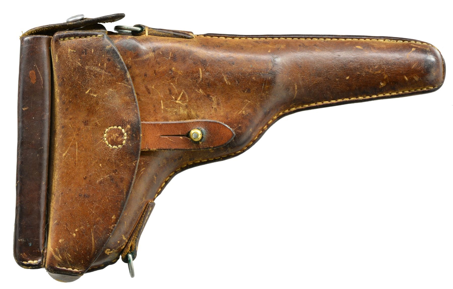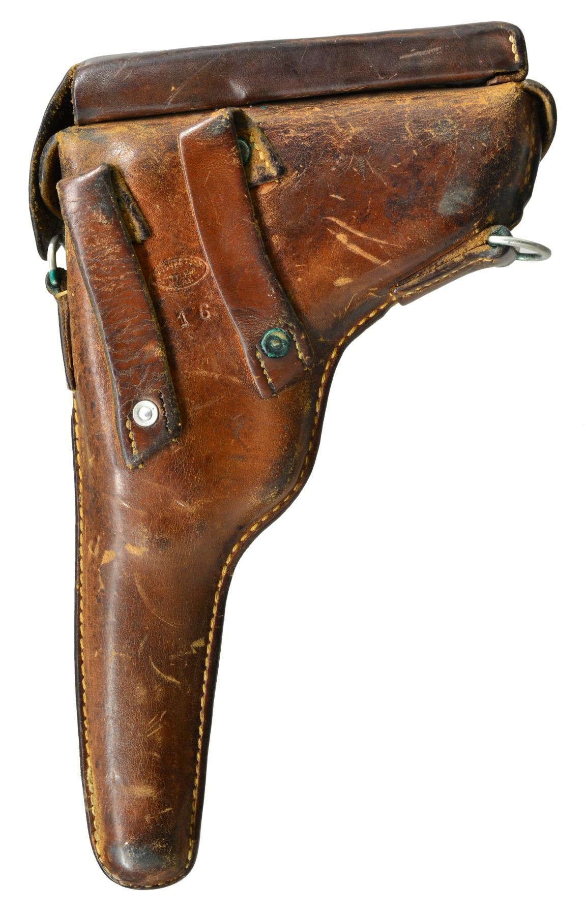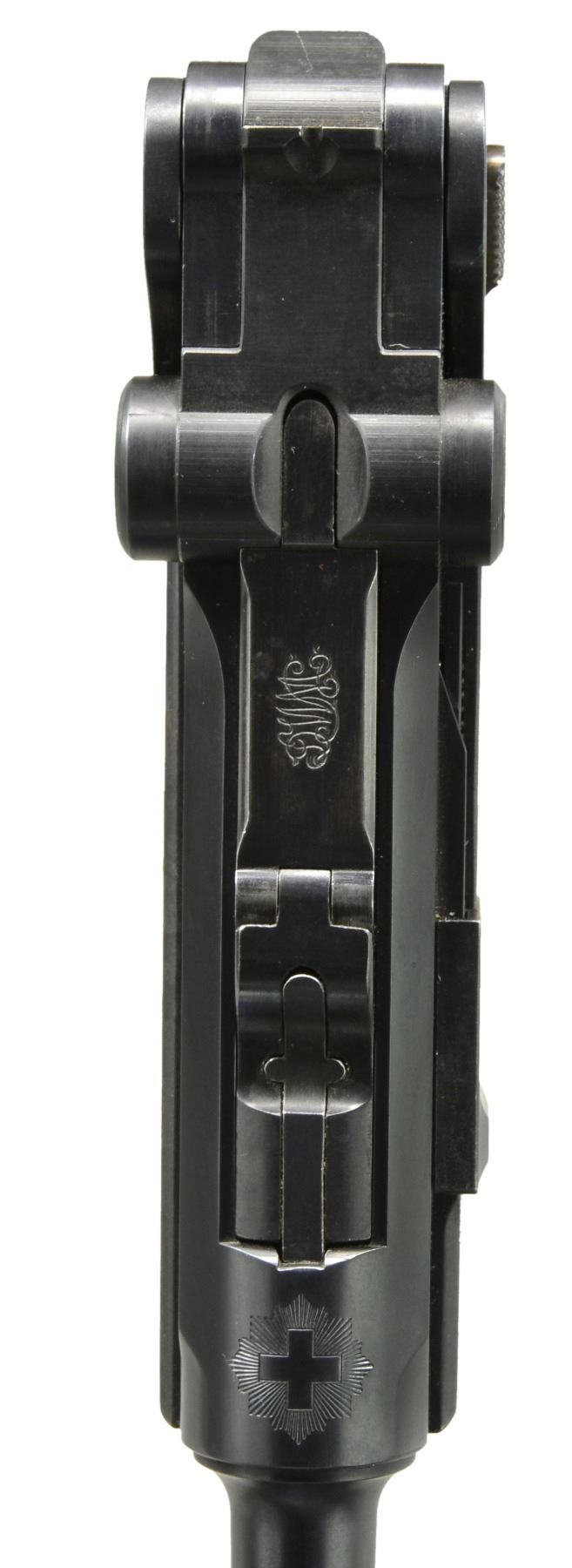 HOLSTER. Cal. 7.65mm Luger. S# 438. A very early Swiss 1900 Commercial Luger, with original, unaltered frame for flat magazine button, reworked and now fitted with a 1929 Bern-type toggle train. The pistol started as a standard configuration M1900 with 4.75" barrel, drift adjustable front sight, narrow trigger and narrow safety. Swiss Cross over chamber. DWM on middle link. Large, first variation checkered safety. Full SN under barrel and forward frame, last two digits on many of the small parts. BU commercial proofs left side of receiver and middle toggle link. At some point the gun was reworked, possibly at Bern, now with a replaced toggle train. The updated breechblock is proofed but unnumbered, the middle link is numbered "31", and the last link, unnumbered, is from a 1929 Bern. Sideplate is unnumbered. The frame was updated to have a coil recoil spring. The left grip is matching; the right grip proofed but unnumbered. MAGS: near excellent original, complete with scarce, early military flat button. UNATTACHED ACCESSORIES: later military holster, added pouch, dated "16". VG+ holster with supple leather and intact, original stitching. CONDITION: approximately 98-99% arsenal blue as reworked with revised toggle train and several unnumbered, updated parts as mentioned. Discreetly import marked using a fine laser etching method in an unobtrusive area. The left grip is missing a tiny chip under the safety. Bright, near-mirror bore, perfect manual mechanics. An interesting Luger, combining many of the earliest and most desirable features of the M1900 Luger with some of Bern"s latest designs. PROVENANCE: From the esteemed collection of Paul Regnier, Switzerland. (20-1421/LA). CURIO. $2,500-4,500.