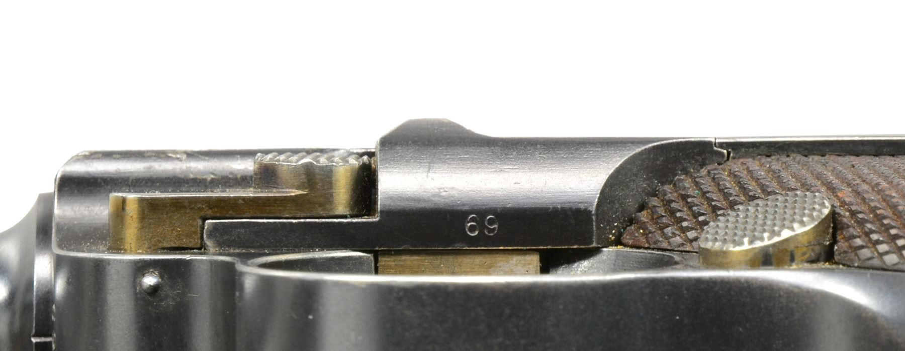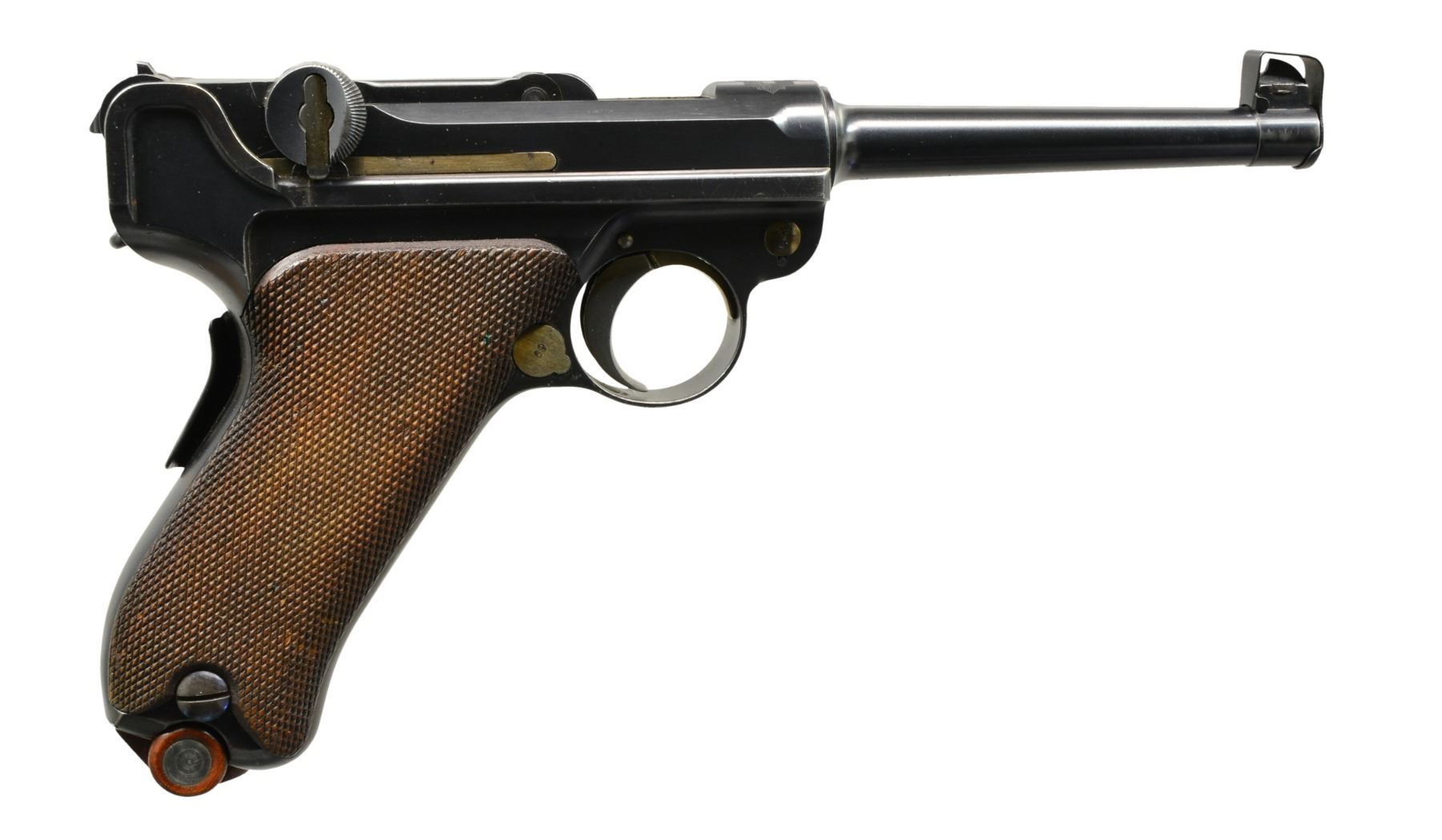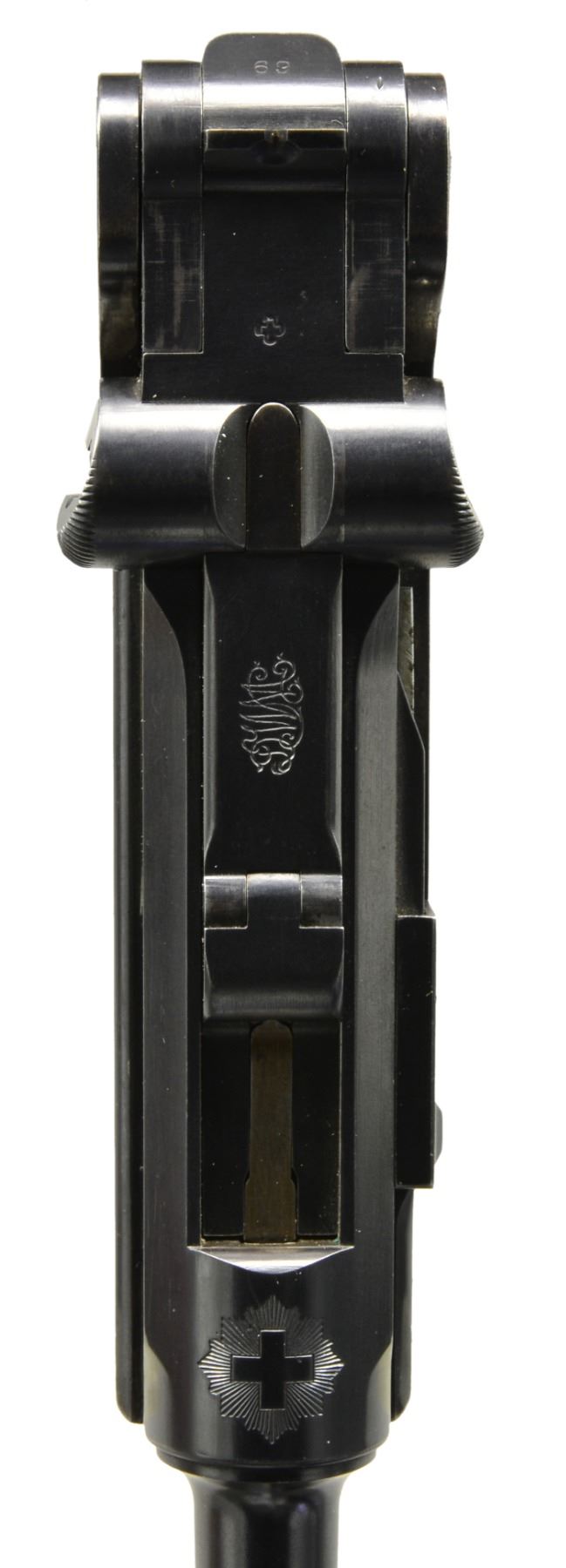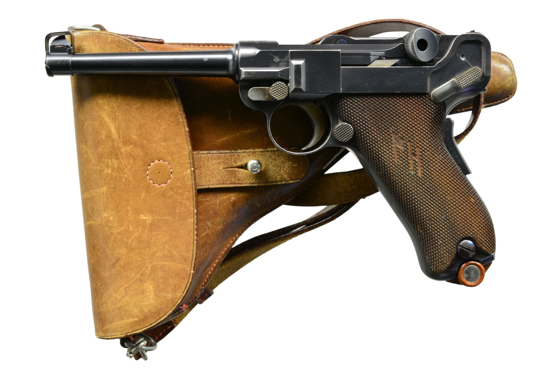CONFIGURATION, HOLSTER. Cal. 7.65mm Luger. S# 369. Seldom offered Swiss M1900 Military Luger in its original configuration, with unrelieved frame, front sight cover, and near excellent, correctly dated holster with straps. Standard configuration M1900 with 4.75" barrel, drift adjustable front sight and "V" notched rear sight. Swiss Cross over chamber. Dished toggle with anti-rebound lock, DWM on middle link, narrow trigger, narrow grip safety, and large, first variation checkered safety. Scattered Swiss acceptance crosses in usual locations, several with nice "haloing" as usually seen in guns with original finish. Major components rust blued. Trigger, takedown lever, extractor, ejector, magazine release button are strawed. Fire blued front sight and grip screws. Finely checkered walnut panels, the left panel with ownership initials "PH". Sight cover marked "H. LUTHY/ARMES/NEUCHATEL". Disassembly shows factory matching numbers on all usual parts including both grips. MAGS: correct military flat button with walnut plug and metal discs. UNATTACHED ACCESSORIES: beautiful holster with intact stitching that is very well marked and correctly dated. Leather holster is manufacturer marked and dated "01" on obverse surface. CONDITION: approximately 90+% original rust blue showing usual high-point holster wear and fading of front and backstraps. Discreetly import marked using a fine laser etching method in an unobtrusive area. Comparable condition strawed and fire blued parts that show no evidence of enhancement. Mirror bright bore. Near excellent manual mechanics. A very nice, no-excuse, Swiss M1900 Military Luger with all the earliest features including the unrelieved frame and correct magazine, well suited for the most serious collector! PROVENANCE: From the esteemed collection of Paul Regnier, Switzerland. (20-1412/LA). CURIO. $8,500-12,500.