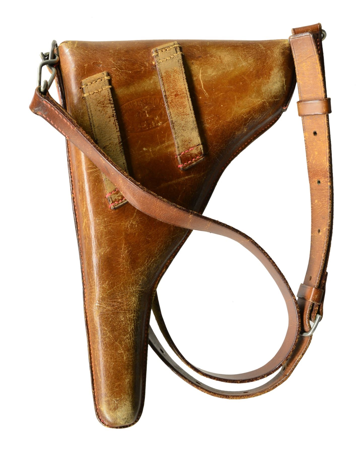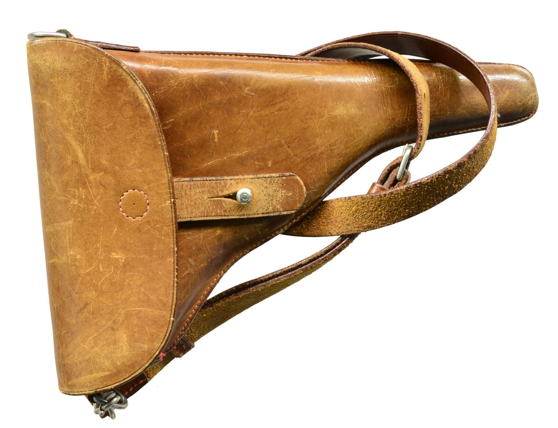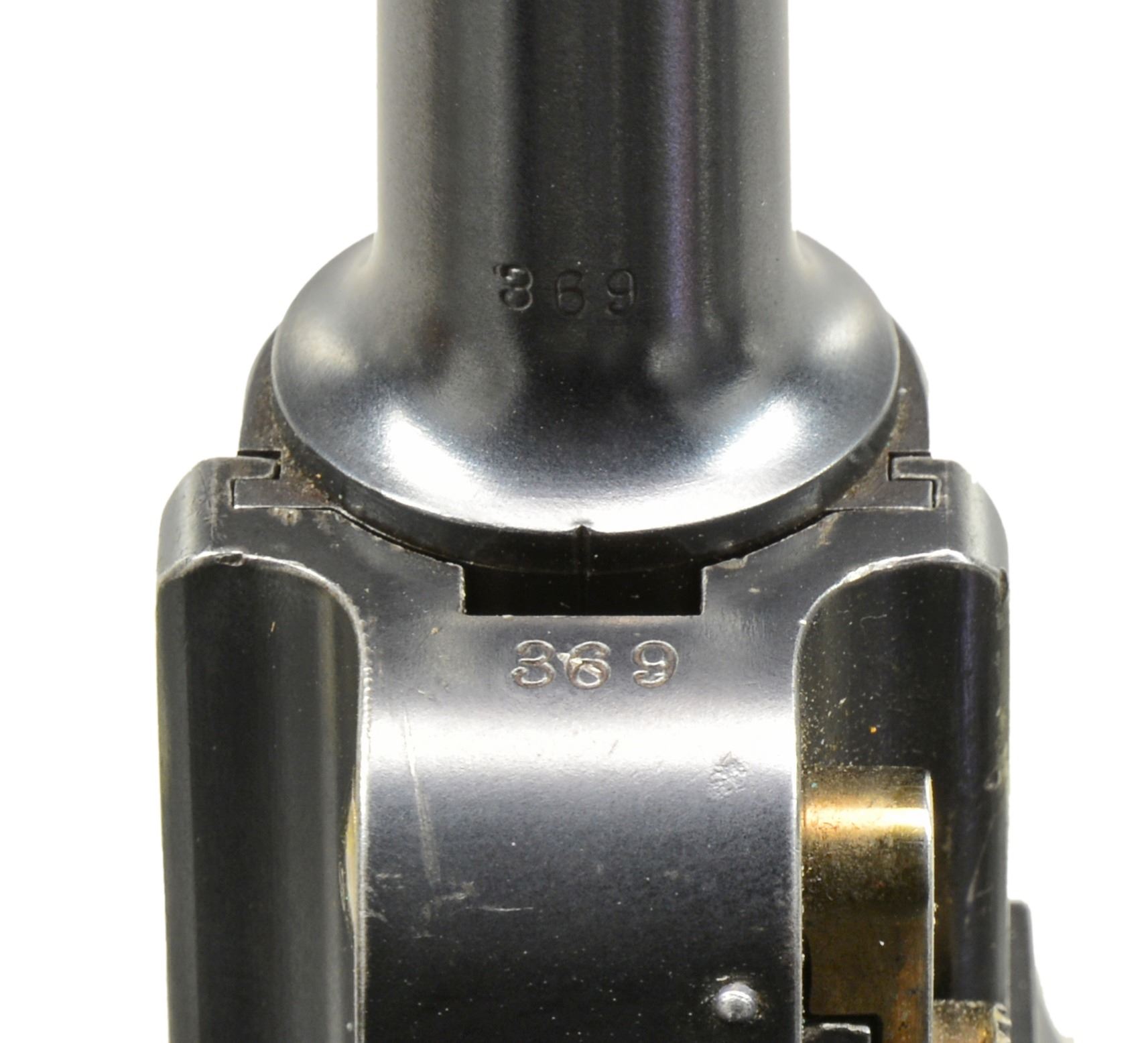 CONFIGURATION, HOLSTER. Cal. 7.65mm Luger. S# 369. Seldom offered Swiss M1900 Military Luger in its original configuration, with unrelieved frame, front sight cover, and near excellent, correctly dated holster with straps. Standard configuration M1900 with 4.75" barrel, drift adjustable front sight and "V" notched rear sight. Swiss Cross over chamber. Dished toggle with anti-rebound lock, DWM on middle link, narrow trigger, narrow grip safety, and large, first variation checkered safety. Scattered Swiss acceptance crosses in usual locations, several with nice "haloing" as usually seen in guns with original finish. Major components rust blued. Trigger, takedown lever, extractor, ejector, magazine release button are strawed. Fire blued front sight and grip screws. Finely checkered walnut panels, the left panel with ownership initials "PH". Sight cover marked "H. LUTHY/ARMES/NEUCHATEL". Disassembly shows factory matching numbers on all usual parts including both grips. MAGS: correct military flat button with walnut plug and metal discs. UNATTACHED ACCESSORIES: beautiful holster with intact stitching that is very well marked and correctly dated. Leather holster is manufacturer marked and dated "01" on obverse surface. CONDITION: approximately 90+% original rust blue showing usual high-point holster wear and fading of front and backstraps. Discreetly import marked using a fine laser etching method in an unobtrusive area. Comparable condition strawed and fire blued parts that show no evidence of enhancement. Mirror bright bore. Near excellent manual mechanics. A very nice, no-excuse, Swiss M1900 Military Luger with all the earliest features including the unrelieved frame and correct magazine, well suited for the most serious collector! PROVENANCE: From the esteemed collection of Paul Regnier, Switzerland. (20-1412/LA). CURIO. $8,500-12,500.