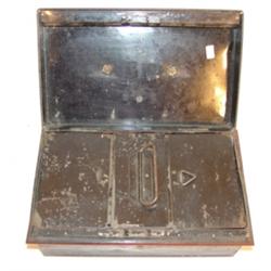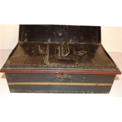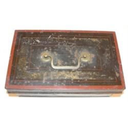 EARLY TIN CASH BOX with tray compartment. Severe loss to paint throughout. Black paint with yellow and red band decoration. 4" H, 9.75" W, 6" D
