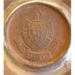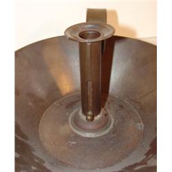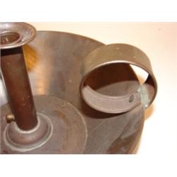 EARLY TIN PUSH-UP CANDLESTICK with basin. Heavily polished. Marked on bottom "London-B P & S" with crest. 3" H, 10" Dia.