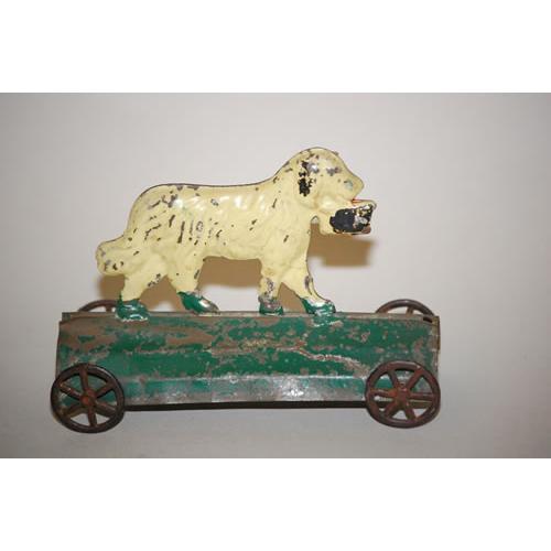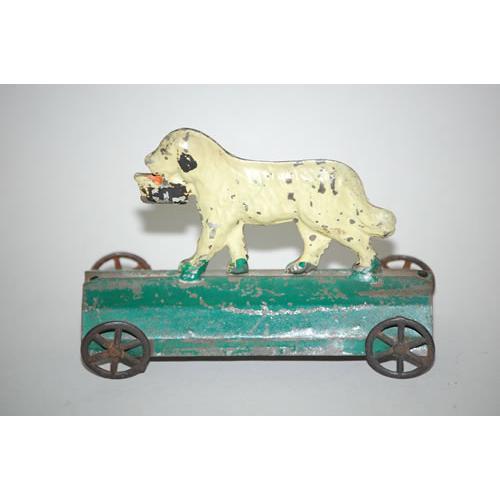 EARLY TIN SAINT BERNARD PULL TOY - 4 1/2" PAINTED TIN SAINT BERNARD DOG PULL TOY W/ BASKET IN MOUTH-OFF WHITE/CREAM COLORED DOG W/ BROWN BASKET ON GREEN PAINTED TIN BASE ON IRON WHEELS (ATTRIB. GEO. BROWN) - MINOR PAINT LOSSES & WEAR, IMPERFECTIONS