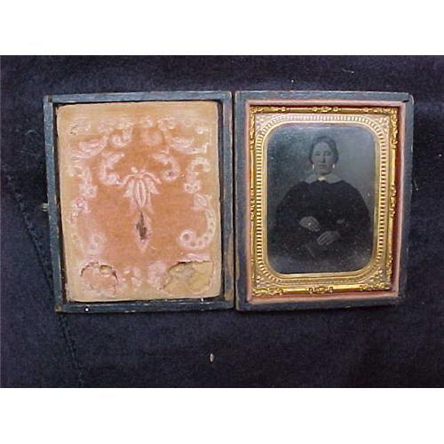 GREAT EARLY TINTYPE OF A VERY PROPER LADY OF THE PERIOD. ITS UNUSUAL BECAUSE HER JEWELRY HAS ALL BEEN HIGHLIGHTED WITH GOLD PAINT. SHE IS STILL IN HER ORIGINAL CASE. THE CASE HAS LOST ITS HINGE SO IT COMES IN 2 PIECES. THE TINTYPE ONLY MEASURES 2.5" BY 2, THE TINTYPE MEASURES 2.5" BY 2.0" OUTSIDE THE CASE.