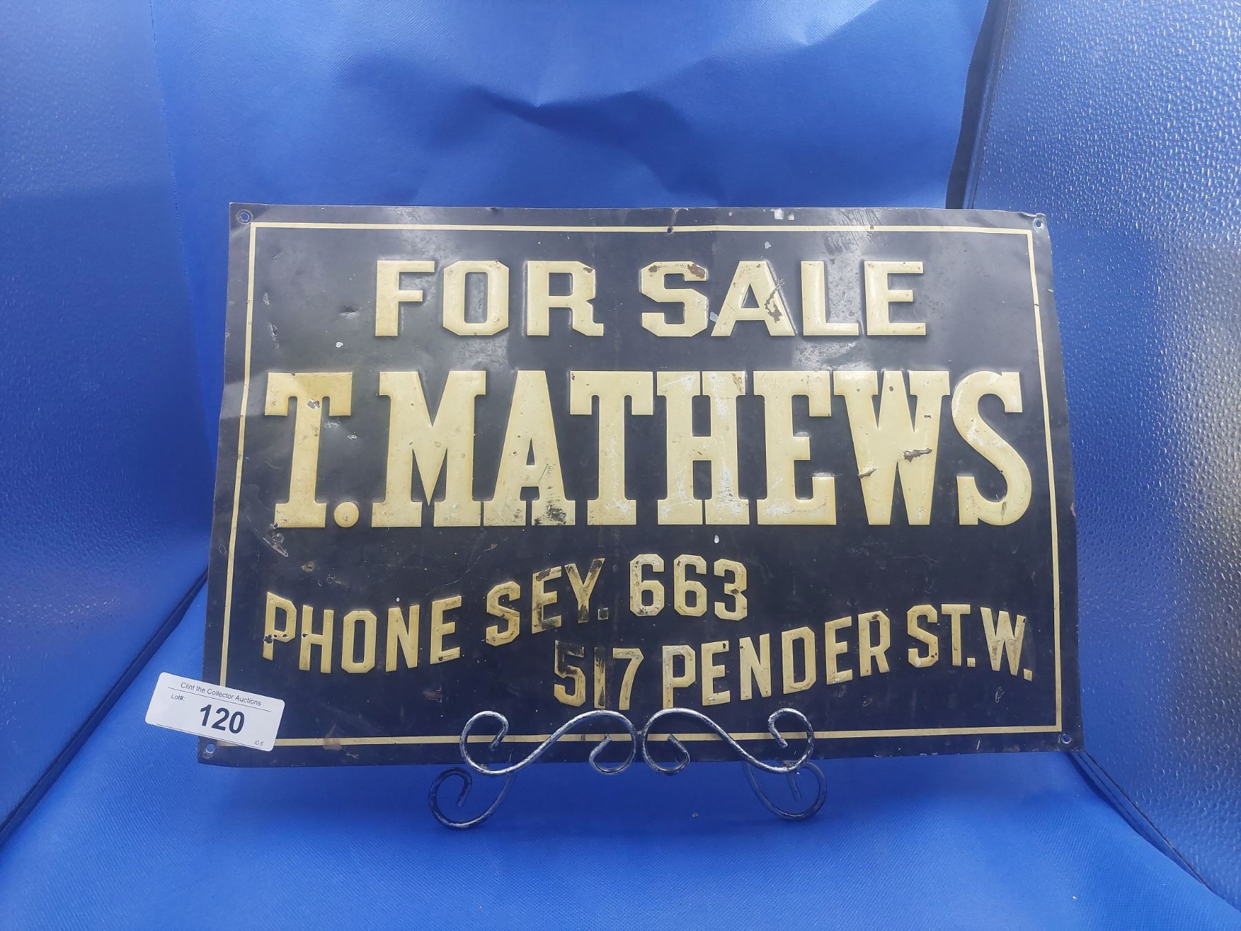 FOR SALE T. MATTHEWS, PENDER STREET TIN TACKER, APPROX 18" X 12"
