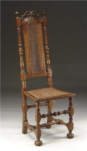 EARLY WILLIAM & MARY CARVED SIDE CHAIR. 17th/18th Century. Having block, vase and ring turnings. Tall back with central caned panel and carved scroll crest. The trapezoid shaped cane seat supported by turned legs having a bulbous turned front stretcher and bottom H-stretcher. Bottom of front legs terminating in compressed ball feet, which are old but probably not original. PROVENANCE: Found in Salem, Massachusetts. SIZE: 50” h x 18” w at front x 18-1/4” seat h. CONDITION: Insect damage, cane damage. Generally intact with old repairs. Break in cane panel back. 9-26562