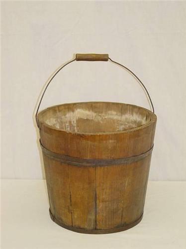 EARLY WOODEN METAL BOUND BUCKET W/ BAIL HANDLE IN NATURAL FINISH - WEAR, IMPERFECTIONS;