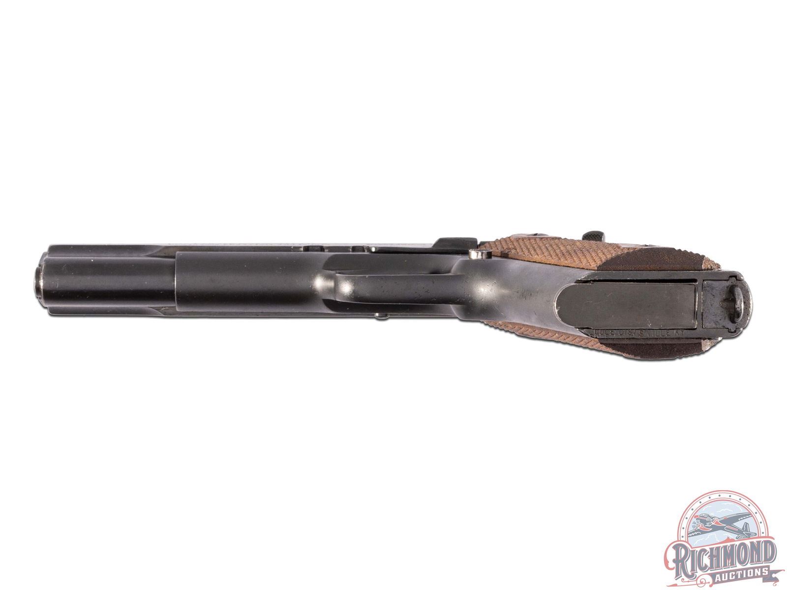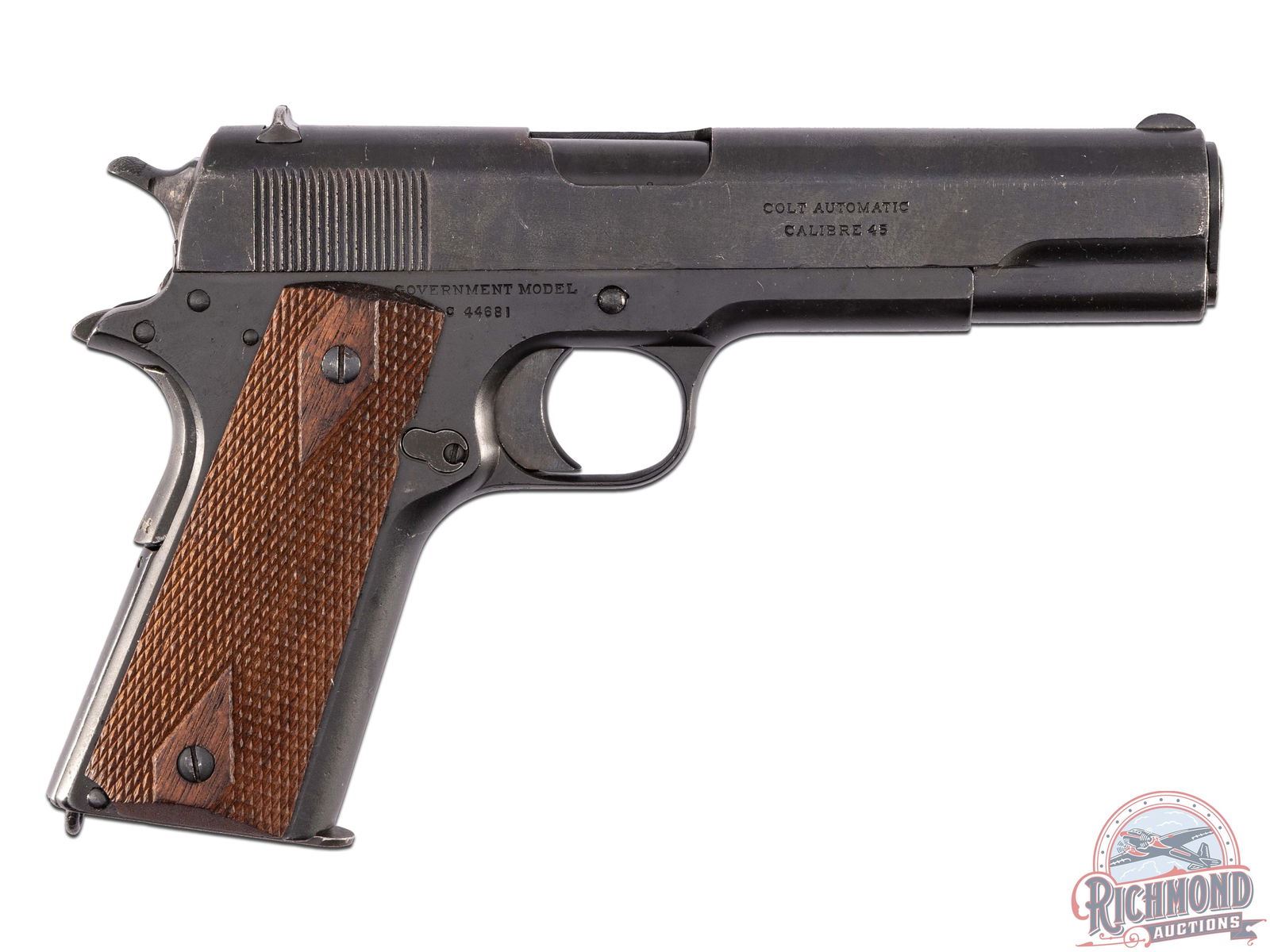 Manufactured in 1916. This early 5-digit serial number 1911 features a 5" barrel, with period correct iron sights. Left side of the slide is stamped "PATENTED APR.20 1897 SEPT, 9 1902 DEC, 19 1905 FEB, 14 1911" and "COLT'S PT. F.A. MFG CO. HARTFORD, CT U.S.A." with the Rampant Colt logo at the rear. Right side of the frame is stamped "GOVERNMENT MODEL / C 44681", and "COLT AUTOMATIC / CALIBRE 45" on the slide. The base of the safety grip is stamped "9108". Features period correct lanyard loop and diamond checkered walnut grip panels. Includes an 8 round magazine. A nice edition to any Colt collection! CALIBER: 45 ACP. S/N: C44681. FFL STATUS: Curio & Relic.