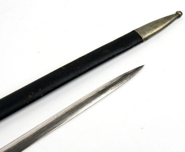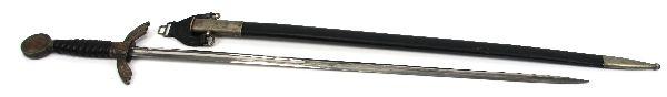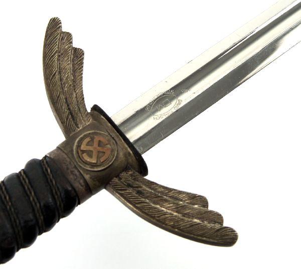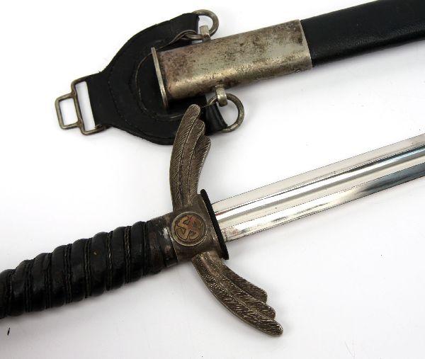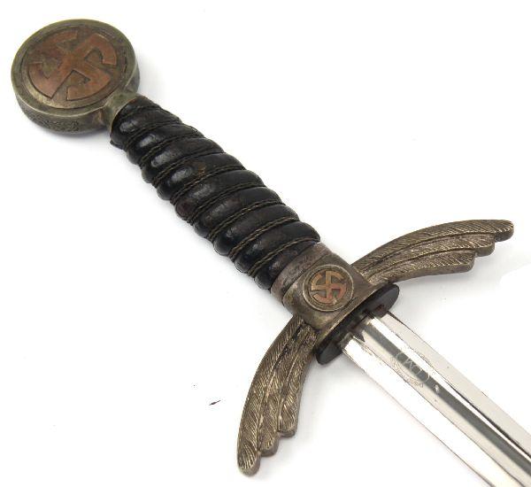 WWII German early Luftwaffe sword. Maker marked David Malsch, Steinbach/Thür surrounding "DM" within single-oval logo. Double edged blade, with center fuller, measures just over 28 inches long. Blue leather grip, with double wire wrap. Disk pommel with swastikas, and cross guard with swastika in center. Leather scabbard, with aluminum throat and chape, two hang rings, and blue leather hanger. Some handling wear to leather grip, scabbard marks to blade, and aging patina to metal hilt and scabbard fittings. Overall very good condition.