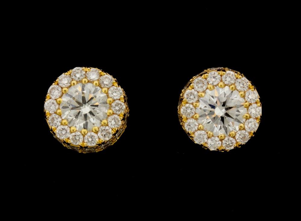EARRINGS: [1 pair] 14KYG earrings set with 88 round diamonds, approx. 1.32 cttw., good/ H/I/ VS2-SI1; and 2 round diamonds (1 in the center of each earring), approx. 0.90 cttw., good/ I/ SI1; diamond total weight is approx. 2.22 cts; one back is broken; 3.3 grams