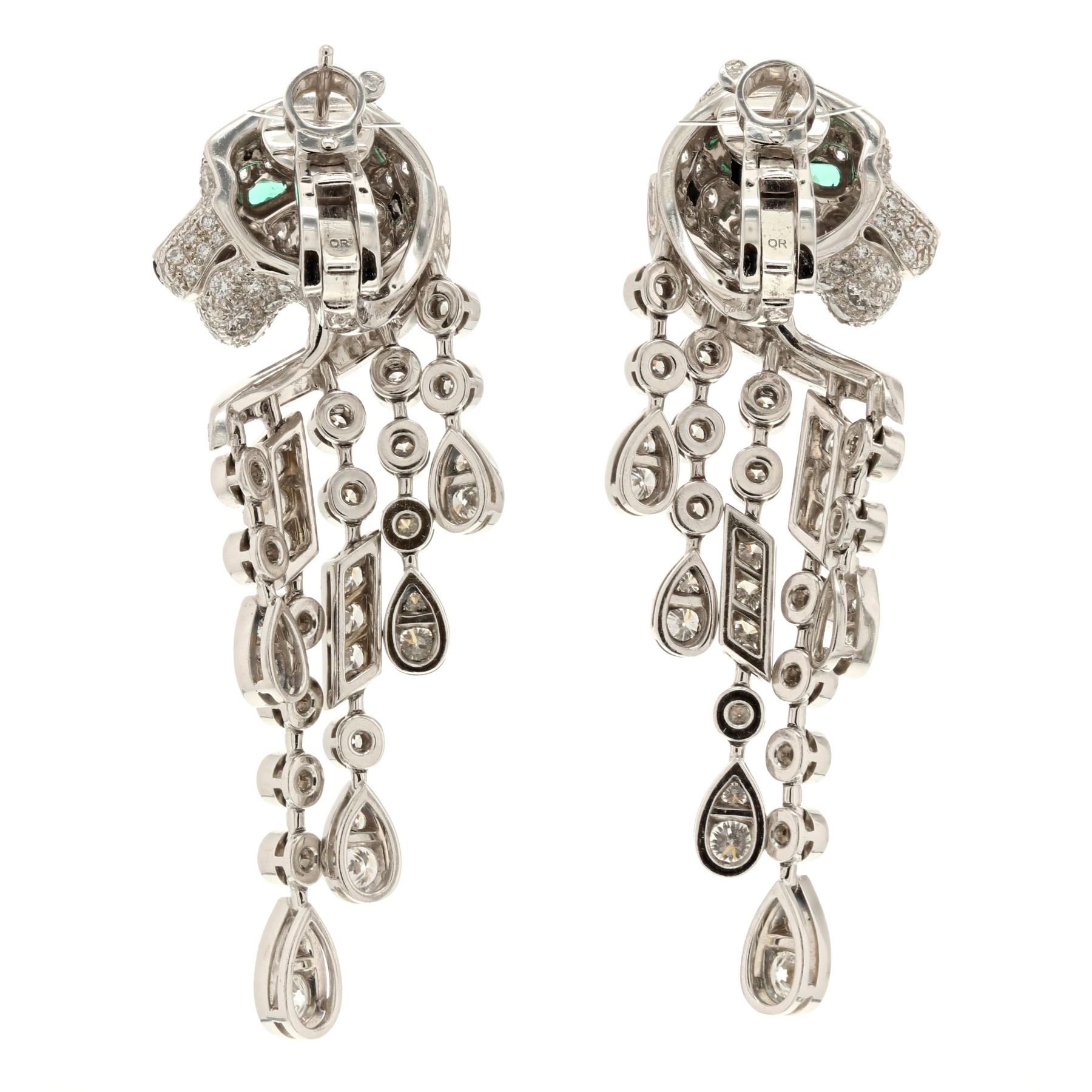 EARRINGS:  [1 pair] Platinum Cartier Panthere earrings set with 310 round diamonds, approx. 5.63 carats total weight, F/G color, VVS-VS clarity; emerald eyes and black onyx spots and nose tips; #XK 3859; 38.6 grams