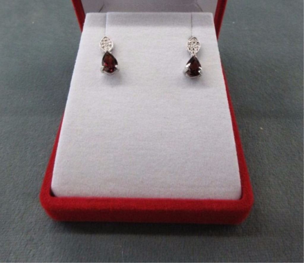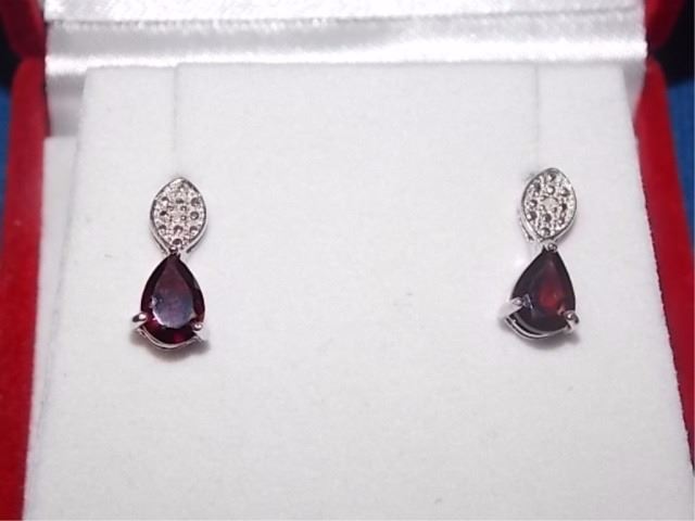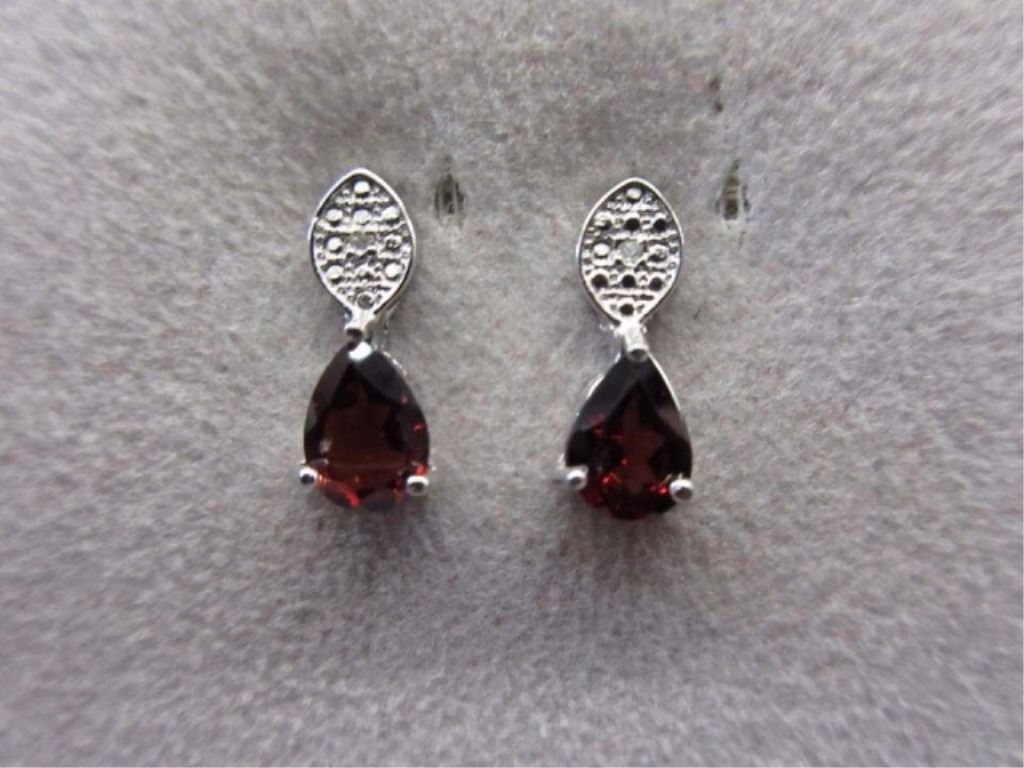 EARRINGS - 2.2 CTW PEAR FACETED GARNET & 2 DIAMONDS IN STERLING SILVER SETTING - RETAIL ESTIMATE $300