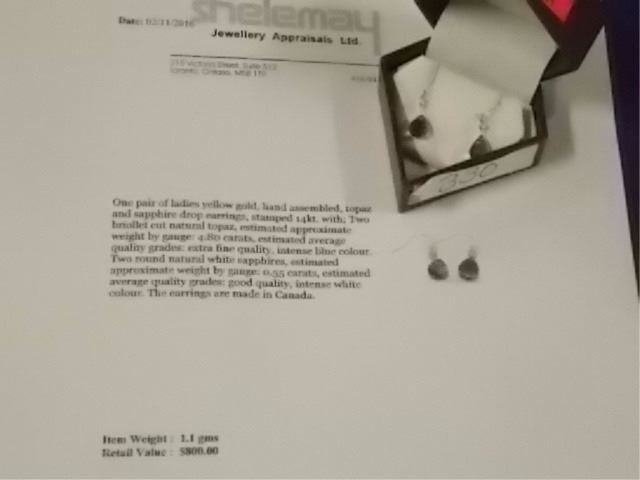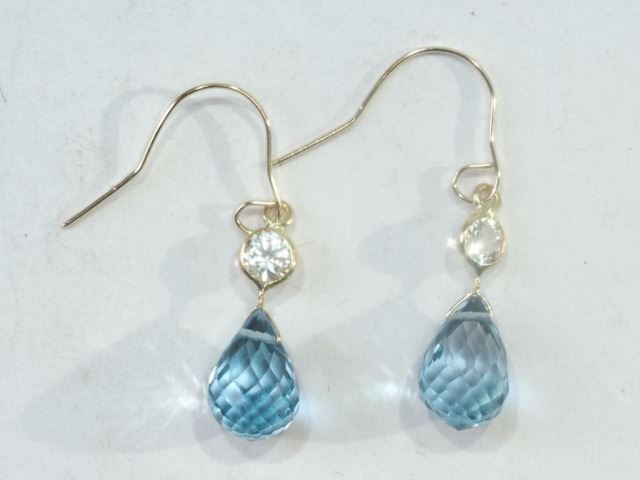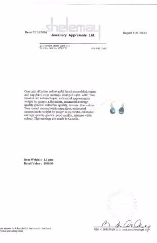EARRINGS - 4.8CT BLUE TOPAZ & WHITE SAPPHIRE IN STAMPED 14K YELLOW GOLD DROP SETTING - HAND CRAFTED IN CANADA - WITH CERTIFICATE $800
