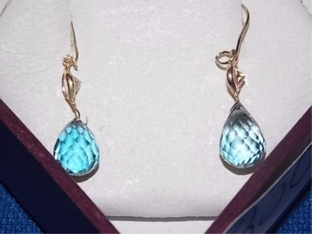 EARRINGS - 4.8CT BLUE TOPAZ & WHITE SAPPHIRE IN STAMPED 14K YELLOW GOLD DROP SETTING - HAND CRAFTED IN CANADA - WITH CERTIFICATE $800