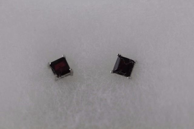 EARRINGS - PRINCESS FACETED GARNET IN STERLING SILVER STUD DESIGNED SETTING - POST & BUTTERFLY BACKS - RETAIL ESTIMATE $375
