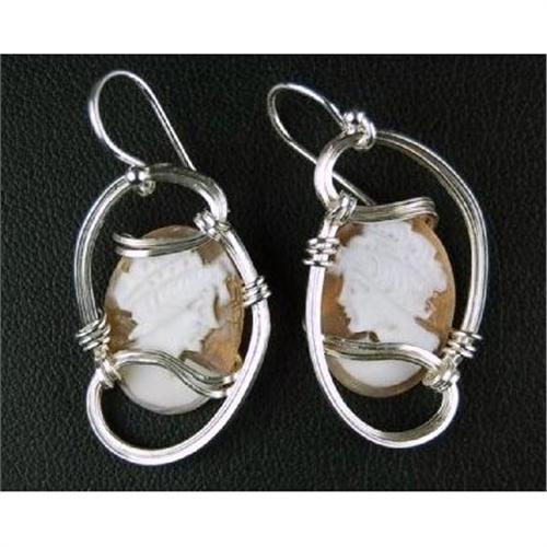 Handmade STERLING Silver Earrings each featuring a Hand Carved Sardonyx Shell CAMEO of the profile of a woman. The Earrings measures 1" in length and they have wire tops for pierced ears.