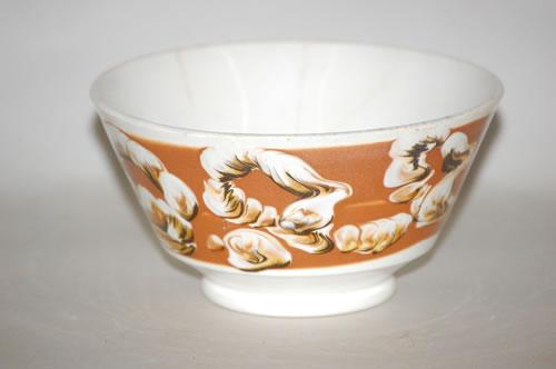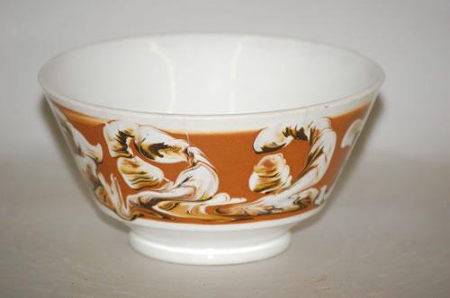 EARTHWORM BANDED MOCHAWARE BOWL - 5 1/2" PEARLWARE MOCHA BOWL W/ WIDE RUSTY BROWN BAND W/ WHITE, BROWN & PUTTY COLORED EARTHWORM DECORATION (3" T X 5 1/2" W)- HAIRLINES, REPAIR, BASE CHIPS, IMPERFECTIONS