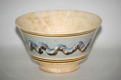 EARTHWORM BANDED MOCHAWARE BOWL - 6 1/4" CREAMWARE MOCHA BOWL W/ A WIDE BLUE BAND W/ BLUE, WHITE & BROWN EARTHWORM DECORATION & FLANKING PAIRS OF BROWN BANDS (3 1/2" T X 6 1/4" W) - HAIRLINES, CHIPS, CRAZING, STAIN, IMPERFECTIONS