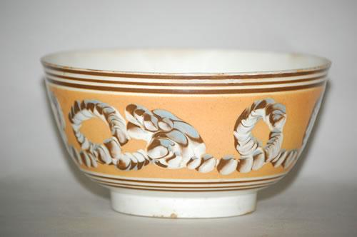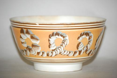 EARTHWORM MOCHAWARE BOWL - 6 1/4" CREAMWARE MOCHA BOWL W/ WIDE BUTTERSCOTCH BAND W/ BLUE, BROWN & WHITE EARTHWORM DECORATION FLANKED BY TRIOS OF THIN BROWN BANDS (3 1/4" T X 6 1/4" W) - RIM REPAIR, BASE HAIRLINE, CRAZING, STAIN, IMPERFECTIONS