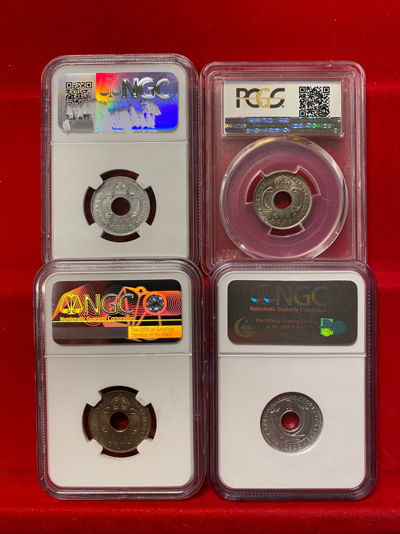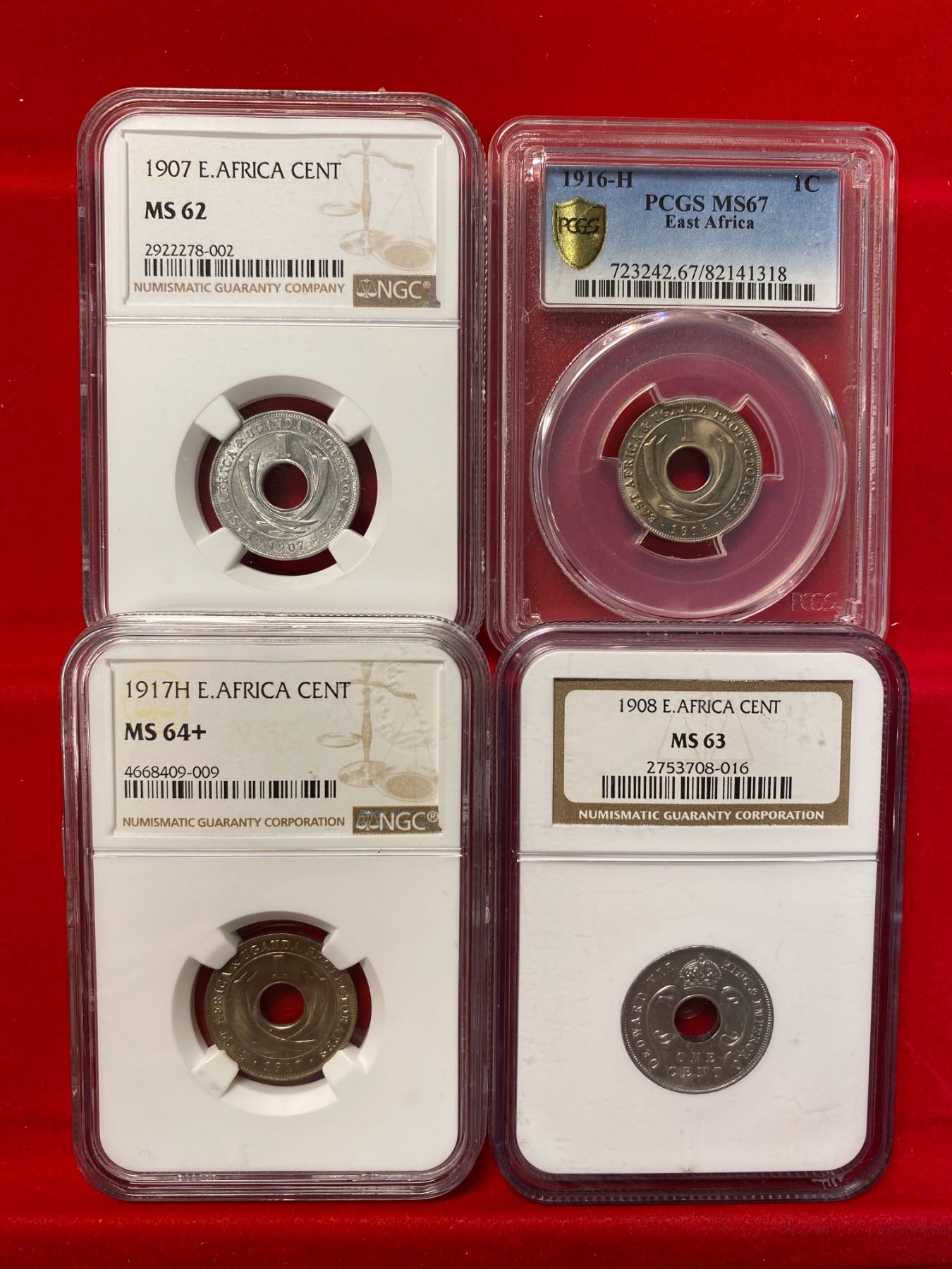 EAST AFRICA & UGANDA: LOT of 4 certified coins, including 1 cent coins 1907 NGC MS62, 1908 NGC MS63, 1916-H PCGS MS67, and 1917-H NGC MS64+; retail value $400, lot of 4 pieces, NGC graded AU58.