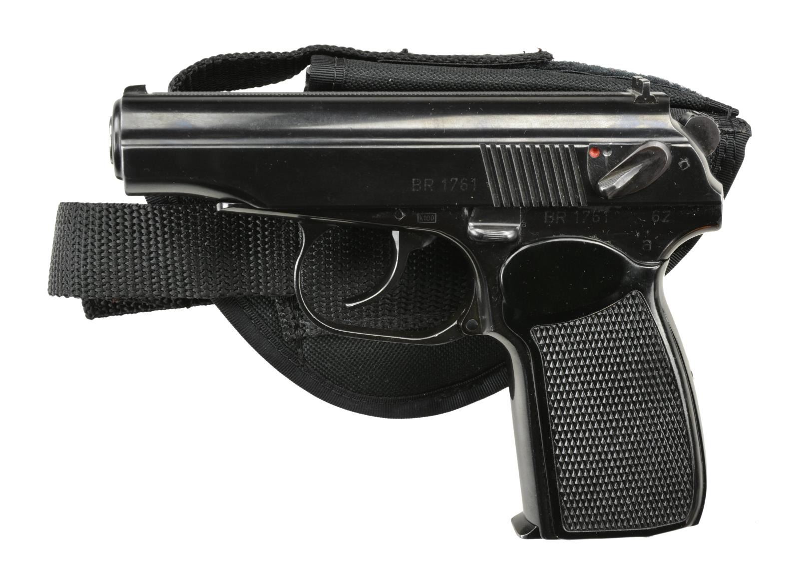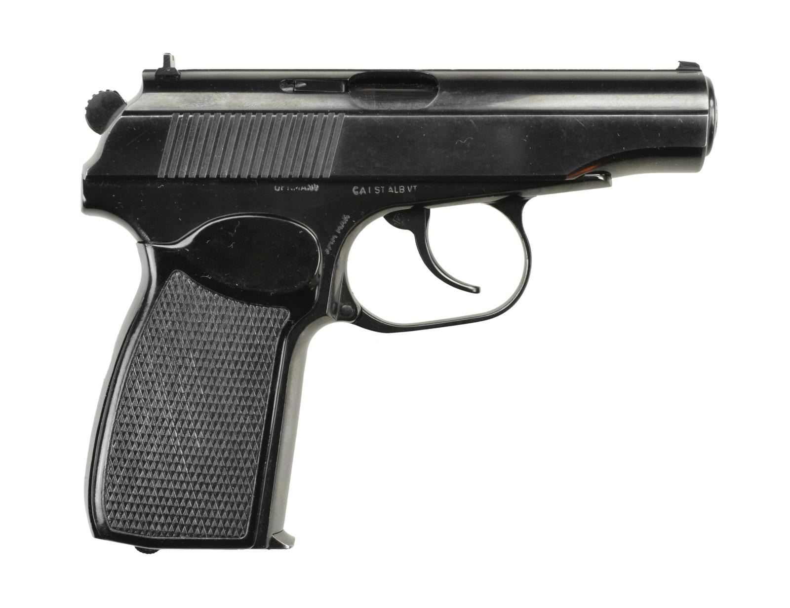 Cal. 9x18 Makarov. S# BR1761. Bbl. 3 3/4". Matching number on slide. Right side of frame has import marking. Left side of frame has boxed "K100" proof & 1962 date. Front sight has added white paint. Checkered black plastic grips. MAGS: 1-8 rd. electro pencil numbered "1440". UNATTACHED ACCESSORIES: modern nylon holster made by Outbags USA. CONDITION: grips show light handling wear. Metal retains 95% original blue w/ light high point & operational wear. Near excellent bore. (22-2447/MJC). CURIO. $200-400.
