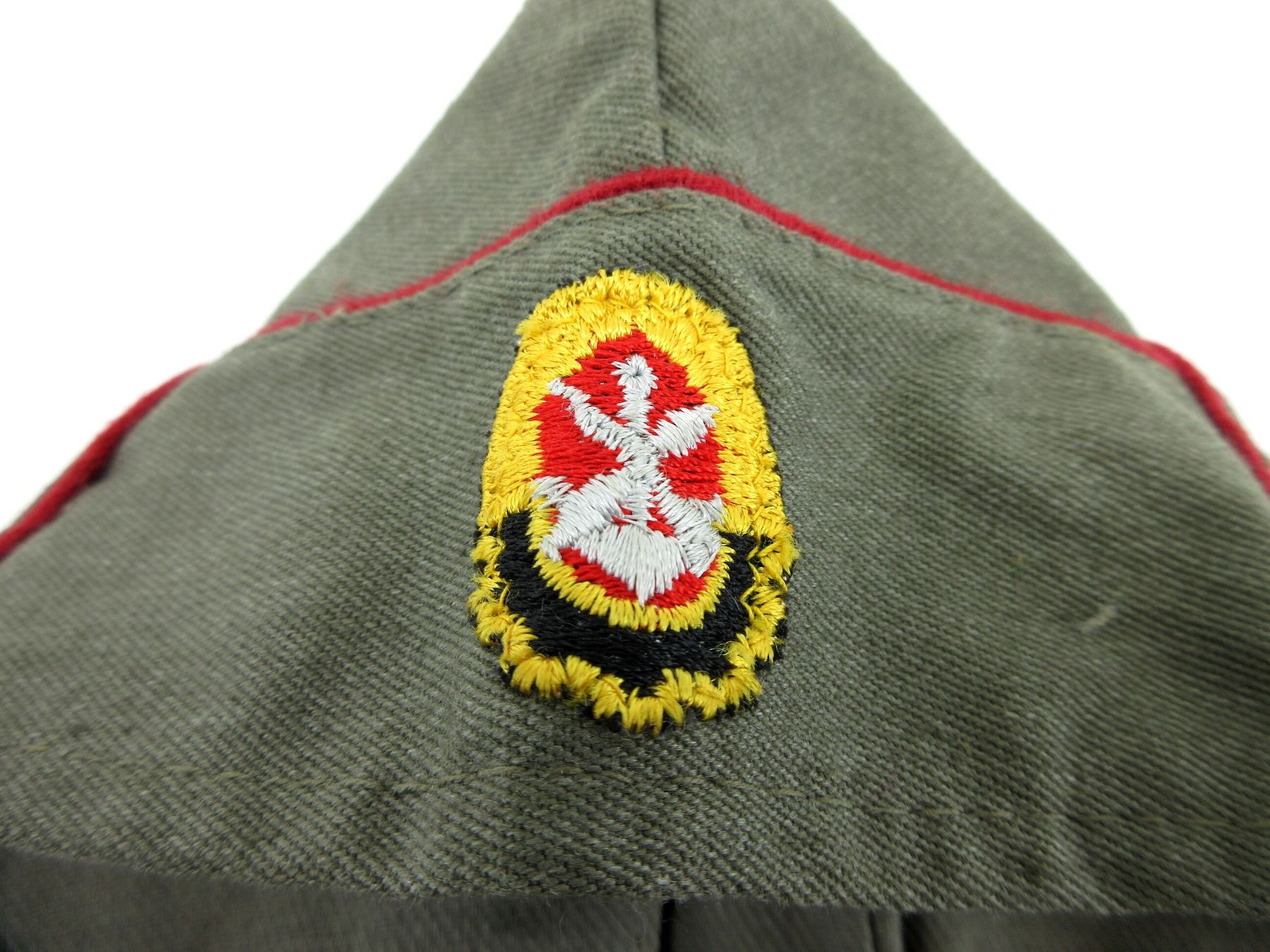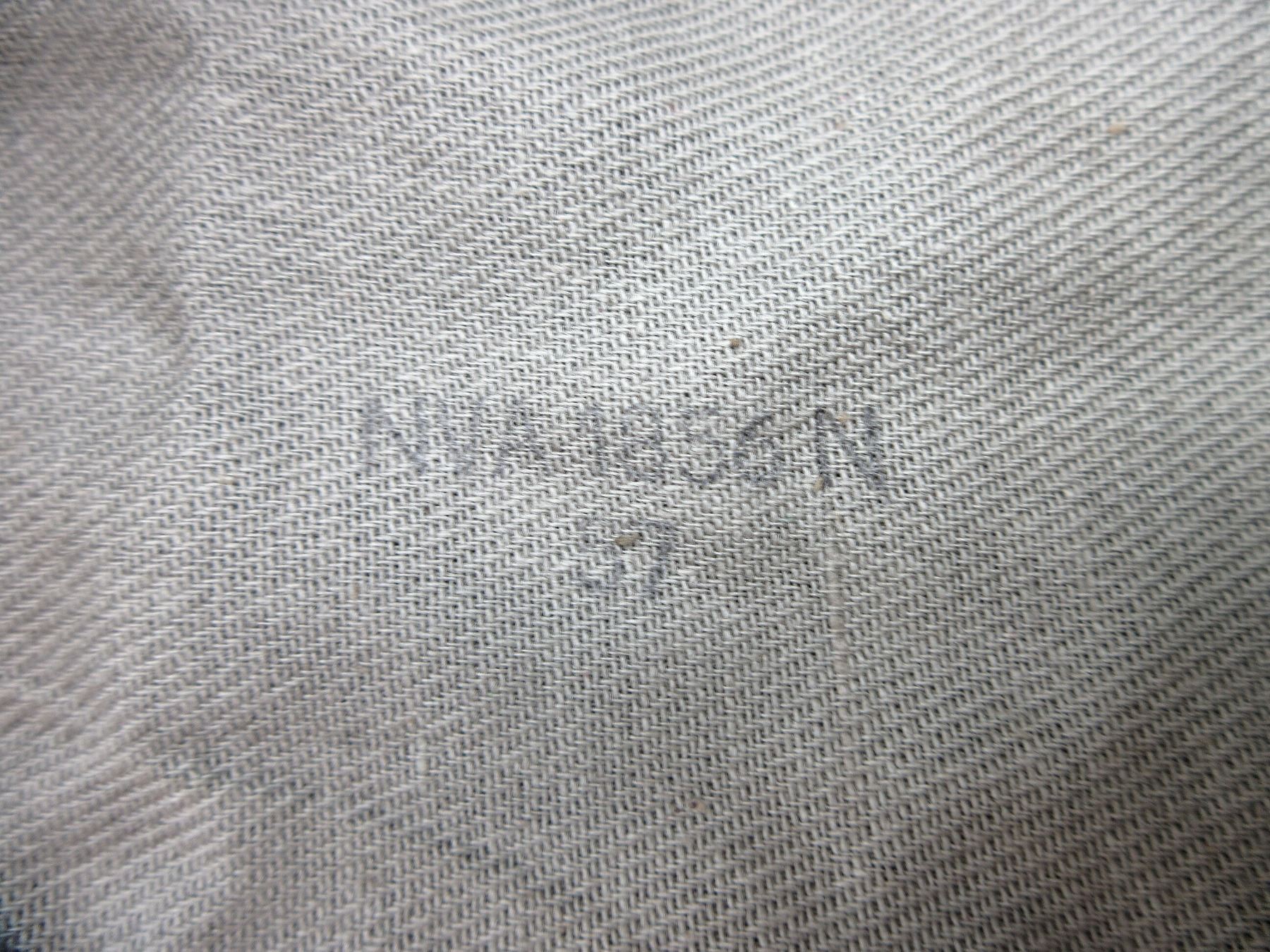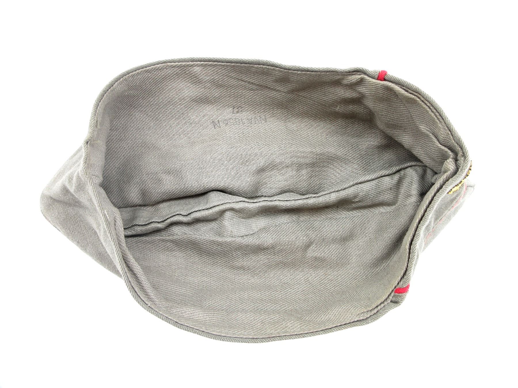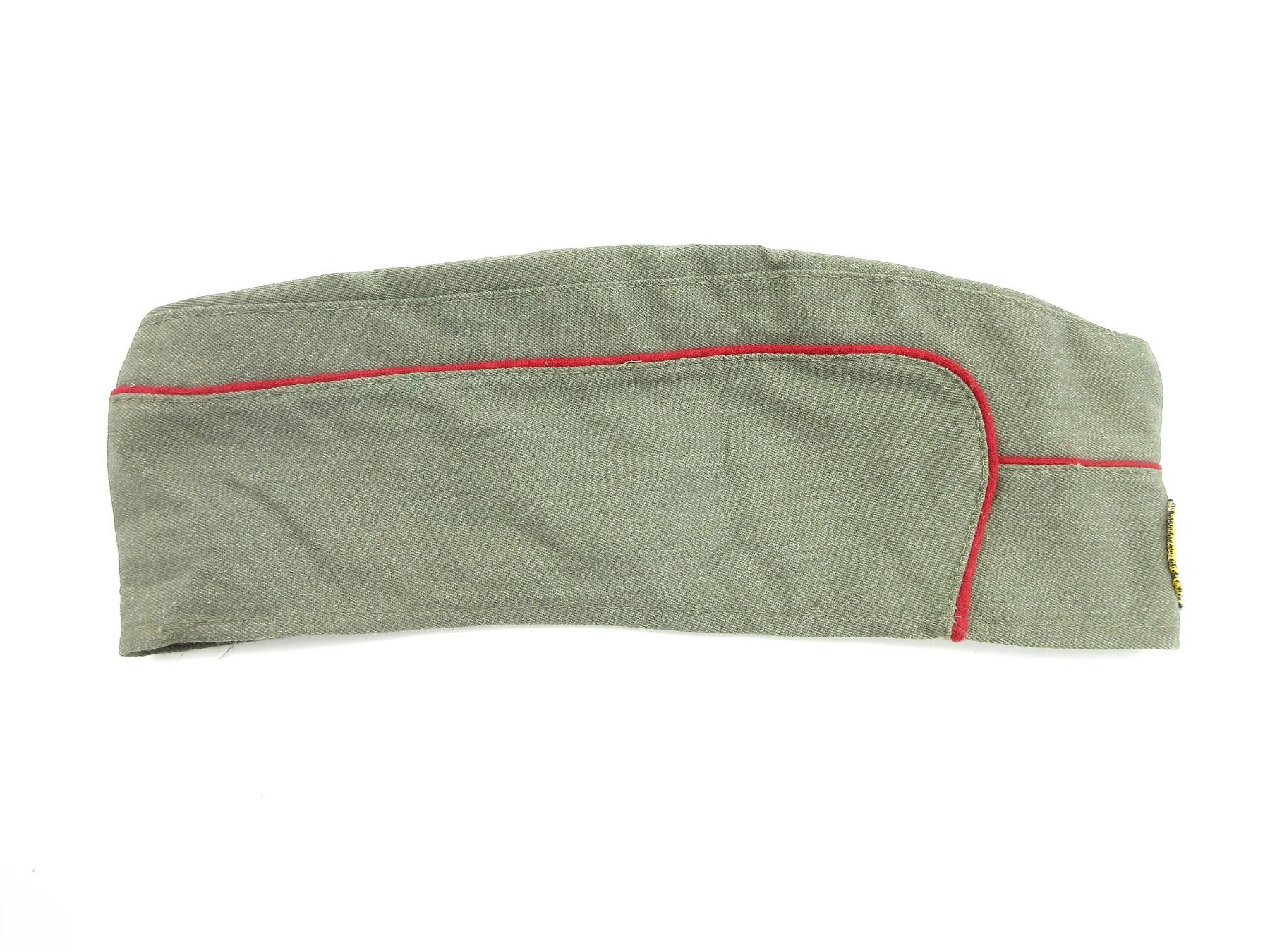 (1) GREY CANVAS WEDGE CAP WITH RED PIPING, EMBROIDERED CAP BADGE, CAP INK STAMPED: "NVA 1856 N, 57". SEE PHOTOS.