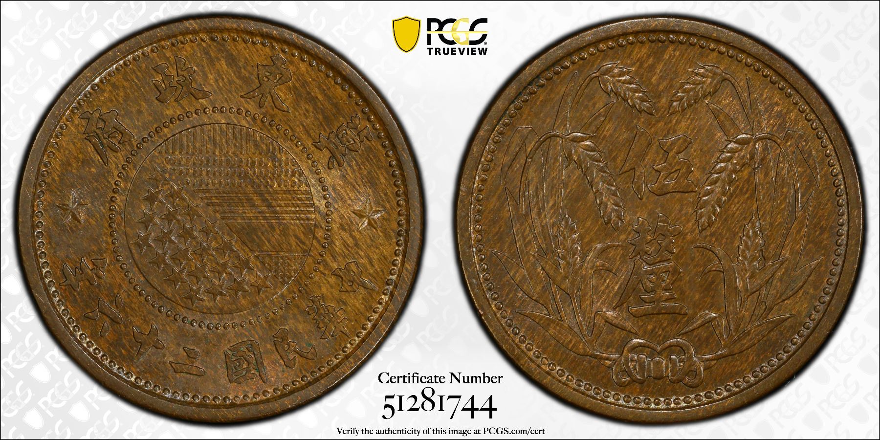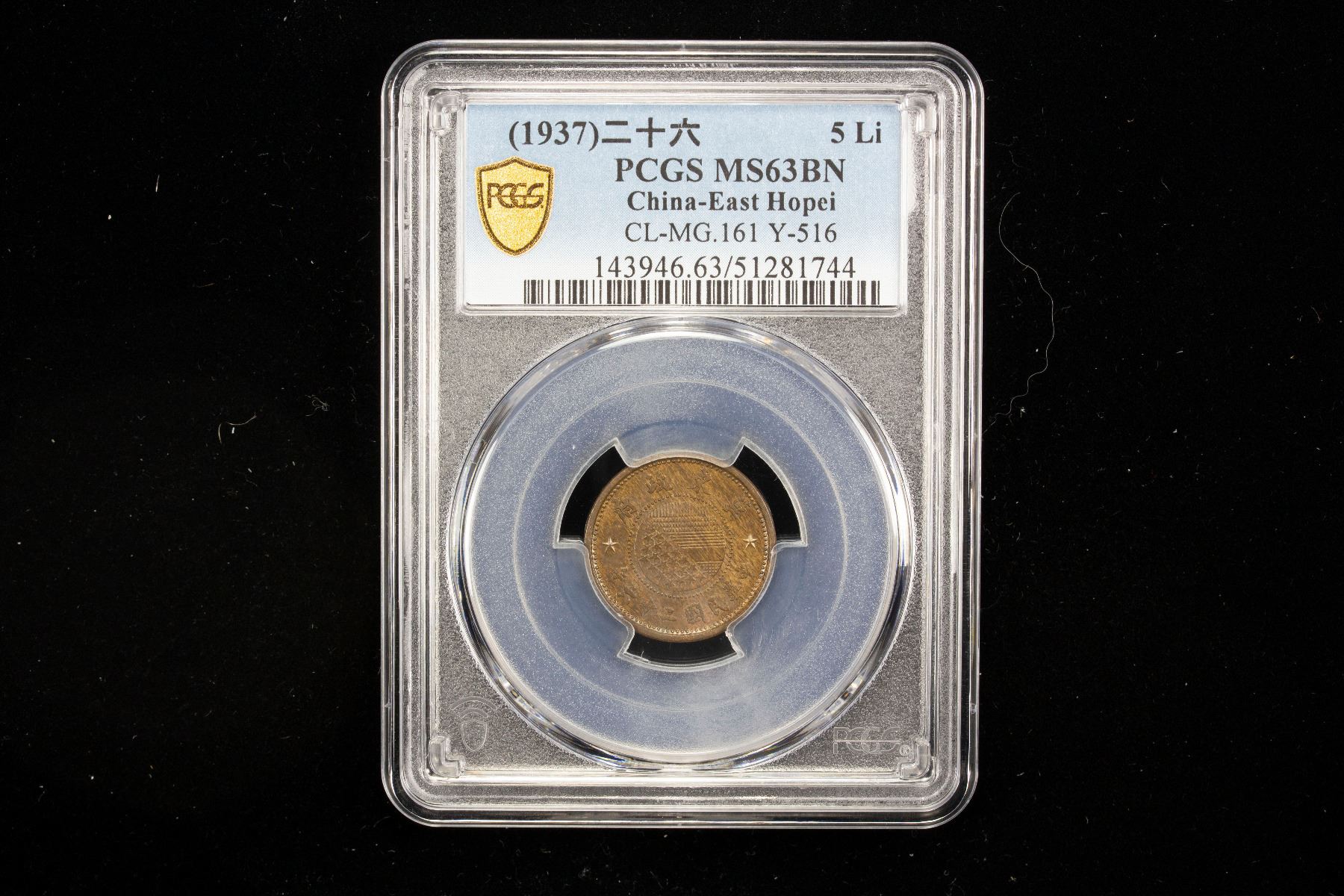 EAST HOPEI: AE 5 li, year 26 (1937), Y-516, CL-MG.161, Japanese Puppet State issue, a lovely lustrous example! PCGS graded MS63 BN. The East Hopeh Government was absorbed into the collaborationist Provisional Government of China in December 1937, then disestablished on February 1, 1938.