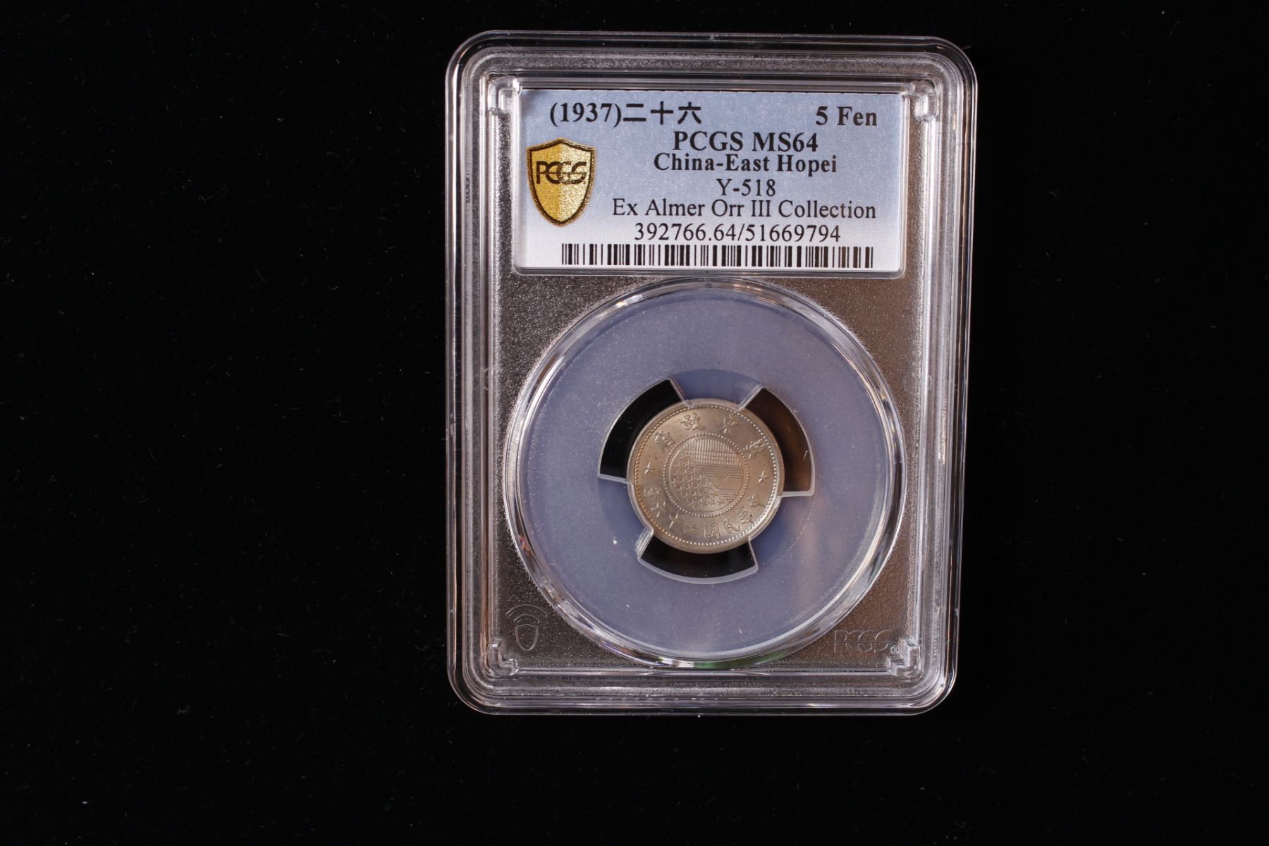 EAST HOPEI: Autonomous Council, 5 fen, year 26 (1937), Y-518, JNDA-21-3, Chi Tung Bank issue, a wonderful lustrous example! PCGS graded MS64, ex Almer H. Orr III Collection. The East Hopei government was absorbed into the collaborationist Provisional Government of China in December 1937, then disestablished on February 1, 1938.
