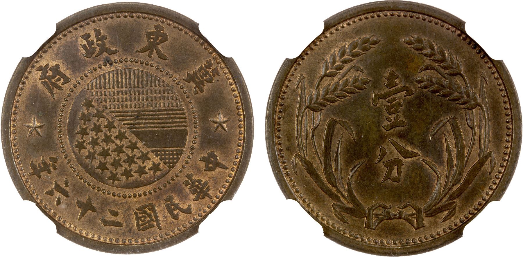 EAST HOPEI: Autonomous Council, AE fen, year 26 (1937), Y-517, Japanese Puppet State issue, a wonderful quality example! NGC graded MS64 BN. The East Hopeh Government was absorbed into the collaborationist Provisional Government of China in December 1937, then disestablished on February 1, 1938.
