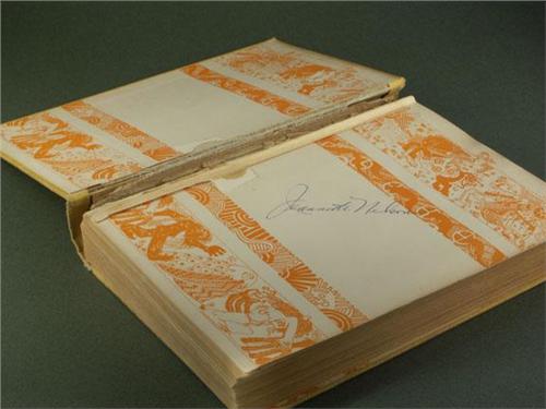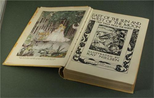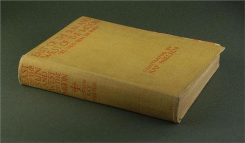 ANTIQUARIAN BOOK: A circa 1920 edition of ''East of the Sun and West of the Moon, Old Tales from the North'', illustrated by Kay Nielsen, 204 pages, mustard cloth with red title to cover and spine (spine separating from binding on interior), orange and white endpapers. Interior cover bearing the inscription, ''Jeanette Nelson''. Tipped in color frontis and 24 other tipped in color plates with captions. Condition: fair.