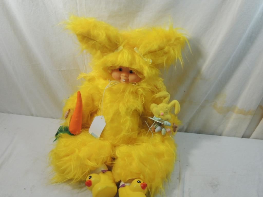 BEAN FILLED BODY, YELLOW BUNNY COSTUME DOLL, CUTE DOLL, HOLIDAY DOLL, VINTAGE STRING HAIR DOLL, SWEET FACE DOLL AS SHOWN SEE PHOTO FOR MORE DETAILS.