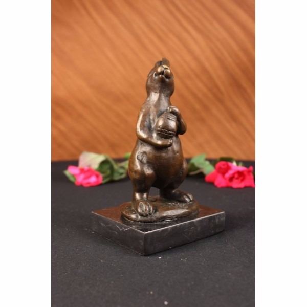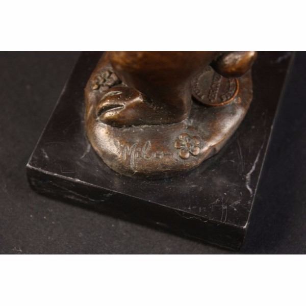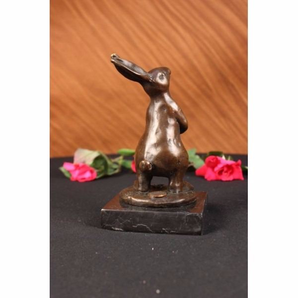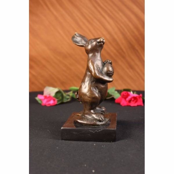 This cute and cuddly lil lady looks up with the sweetest look and holds a tiny basket full of flowers in her tiny arms. This little bunny is the perfect touch of dcor for a sweet and cute look. Her ears are long and she wears a pretty little bow by them. She stands on her hind legs while looking up with full attention. Her facial features are great giving him a little character and capturing a sweet look as if she is smiling. This is a perfect gift to give around spring time and Easter. This sculpture was cast using the "Lost Wax Method" and has a two tone brown patina and is mounted on a black marble base. This sculpture is signed by Milo. World famous sculptor "Milo" is the artistic partner of the Lynn Forbes School of Sculpture-and is offering an exclusive signature in the wax of every piece of his items, which are Custom Cast with European Bronze Finery. In effect it makes EACH SCULPTURE an ORIGINAL since each one is different than the next (similar to a Limited Edition). Again, Milo-our partner-IS THE ORIGINAL SCULPTOR of this incredible work of art. Milo was born in Paris in 1939; Milo lived most of his childhood in Andalusia, Spain. Influenced by an artistic family background, he began sculpting at the age of seventeen. After apprenticing with several accomplished sculptors both in America and Spain, he began his own work focusing equally on steel and bronze. Horses and other animals were a natural direction of his work to follow. Surrounded by horses as a child and witnessing the fighting bulls of Spain gave him an instinct for the inherent drama of these animals. Combining a special cement mixture with steel has allowed him the fluidity of metal with the timelessness of stone. This process enables him to capture the essence of the animal's nature. The characteristic rough texture and movement of line make Milo work easily identifiable in both cement and bronze. Condition: This sculpture is in a very good condition. Bronze Dimensions with Marble Base:Height 6" x Width 3"Marble Dimensions: 3" X 3" Height without base: 5".Weight :3 LBSInventory4112K24914 This cute and cuddly lil lady looks up with the sweetest look and holds a tiny basket full of flowers in her tiny arms. This little bunny is the perfect touch of dcor for a sweet and cute look. Her ears are long and she wears a pretty little bow by them. She stands on her hind legs while looking up with full attention. Her facia