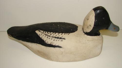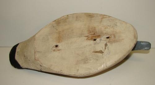 EASTERN SHORE BUFFLEHEAD DECOY. Neck is cracked. Has tack eyes. Shows wear and loss to paint at areas. Signed on bottom of tail "CJS".