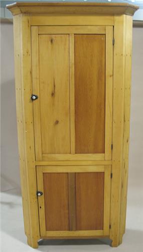 EASTERN SHORE SOFTWOOD CORNER CUPBOARD. Circa 1860. Single double-paneled blind door at top and single double-paneled blind door at bottom. Molded top. Porcelain knobs on doors. Bracket feet. Four shelves at top. Two shelves at bottom. Recently refinished. 83” H, 41” W, 20” D