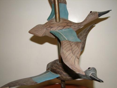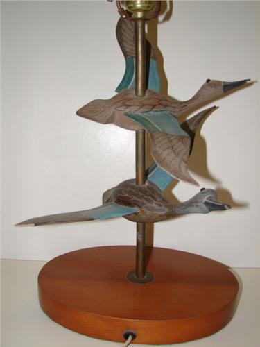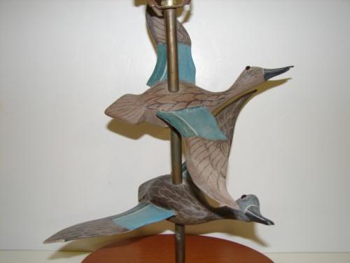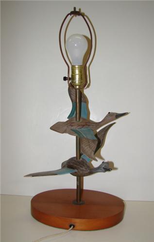 EASTERN SHORE FLYING DECOY LAMP. Unknown carver. Consists of two flying decoys on post. Wooden base. 23.5" H