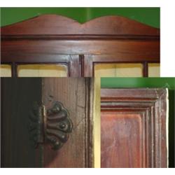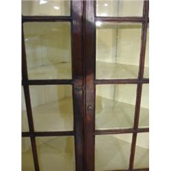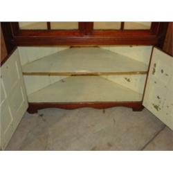EASTERN SHORE HEART PINE CORNER CUPBOARD. Has 2-8 lite doors on top and two raised panel doors on bottom. Pegged construction. Retains original hinges. Cream paint on interior of top and bottom. 80" H, 49" W, 25.75" D