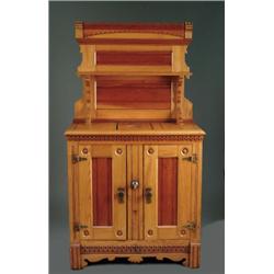 EASTLAKE ICEBOX. Fabulous ornate Victorian icebox featuring twin paneled front doors with interesting hardware, original interior aluminum shelving, intricately carved front and side aprons and original back shelf. Construction appears to be chestnut/ash with beaded cherry panels. SIZE: 37” w., 67” t., 20” d. CONDITION: Very good, with refinished surfaces. 1-3628 (1,600-2,000)