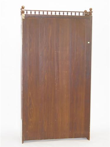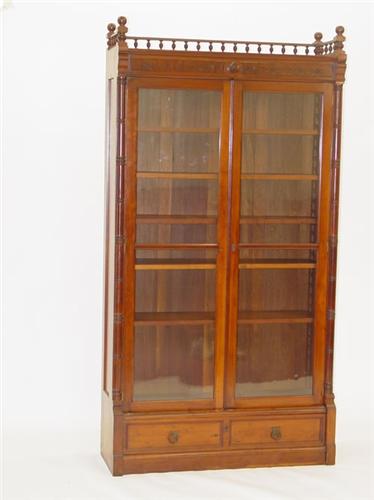 EASTLAKE STYLE VICTORIAN BLACK WALNUT GLASS DOOR CABINET W/ (2) 4 PANEL GLASS DOORS W/ 5 SHELF INTERIOR OVER (1) DRAWER, W/ CARVED CREST PANEL & BALL TOP GALLERY (77" T X 40" W X 14 1/2" D) - SM. GLASS CRACK, REPAIRS & IMPERFECTIONS