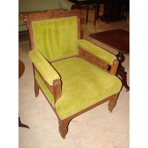 EASTLAKE WALNUT ARM CHAIR. Carving on crest rail and on pierced side panels under arms. Reeded arm uprights and legs with casters. Square back panel, arm pads, and seat upholstered in green velvet. 37.5” H to top of back, 28” W. From the Estate of Governor Elbert N. Carvel (Governor of Delaware 1949-1953, 1961-1965) & Mrs. Ann Valliant Carvel.