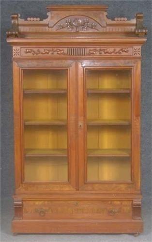 EASTLAKE WALNUT DOUBLE DOOR STEP BACK BOOKCASE with original finish height: 78",width: 40" depth: 16" (at base)