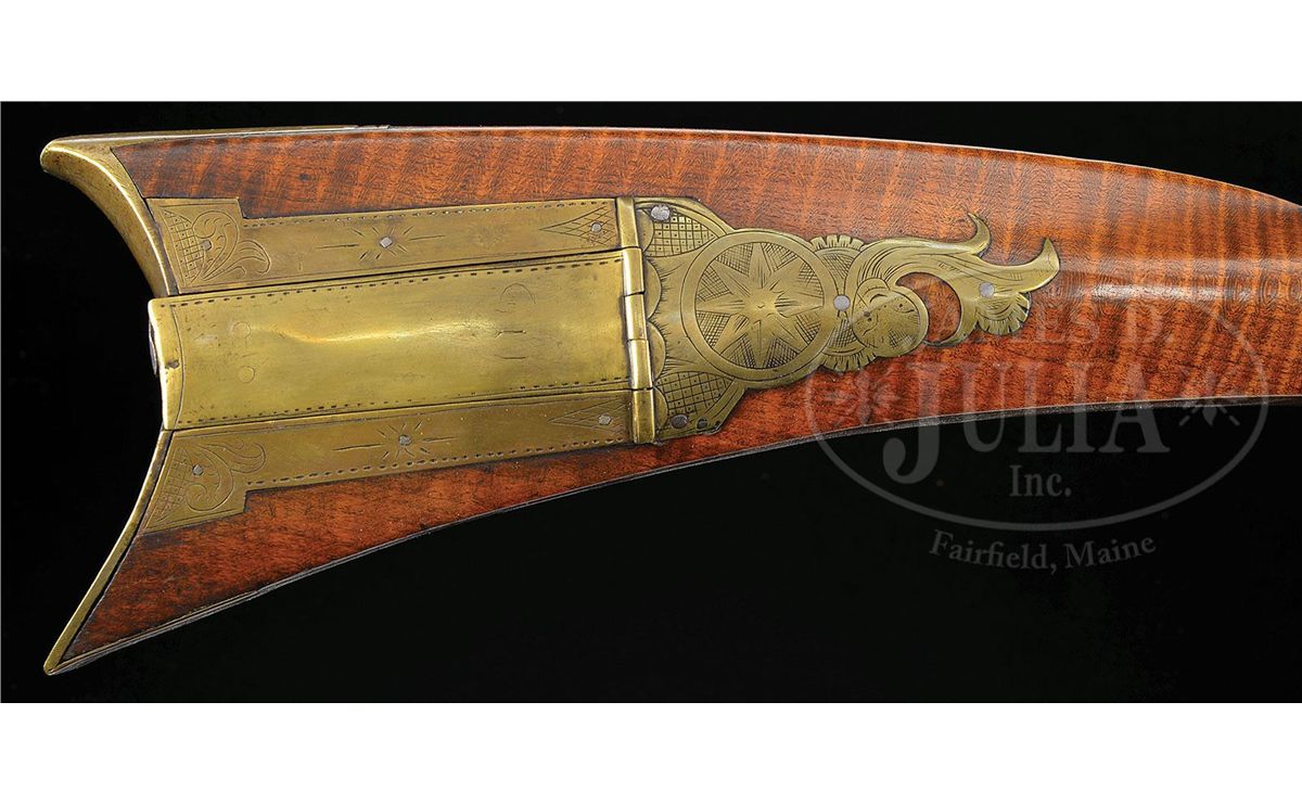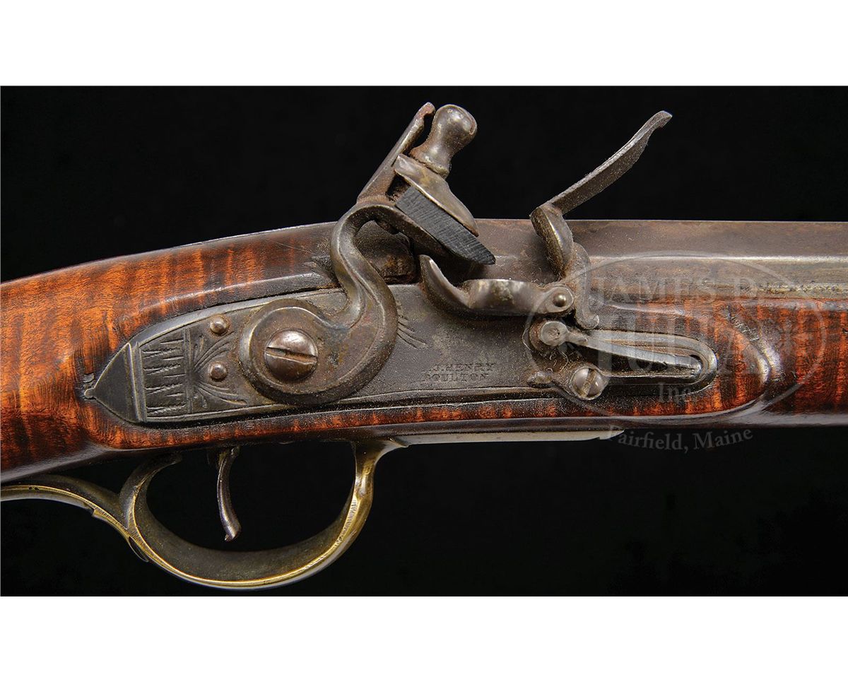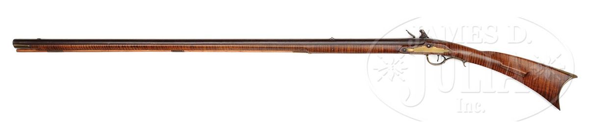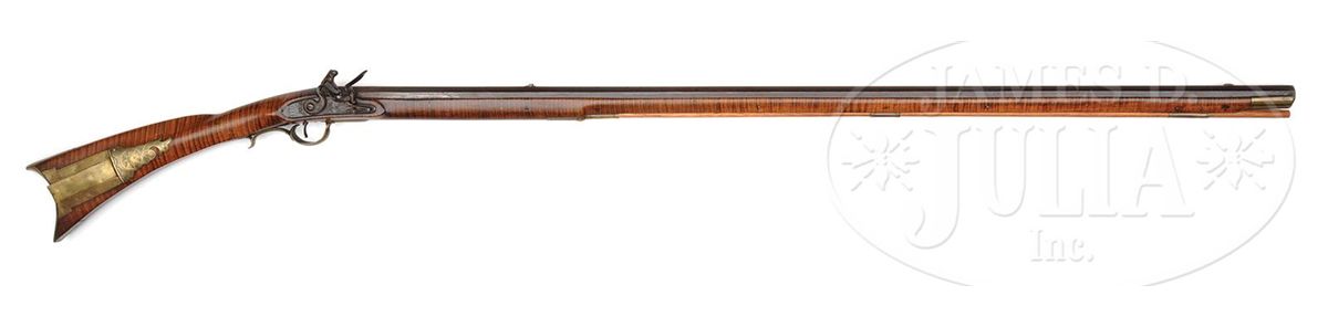 NSN. Cal. .50 smoothbore. Rifle has a 44" full oct unsigned bbl. Rifle has a very nice curly maple stock and a 4-piece engraved patchbox. Rifle appears to have been made in the Easton area of the Northampton school and may be attributed to the gunsmith J. Demuth. PROVENANCE: Collection of Woody Frey. CONDITION: Generally very good. Condition appears to be clean and original throughout with a replacement ramrod. 4-48501 RG18