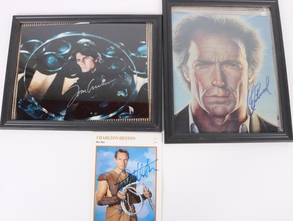 Clint Eastwood autographed portrait photo, one Charlton Heston autographed photo and one Tom Cruise autographed photo.
