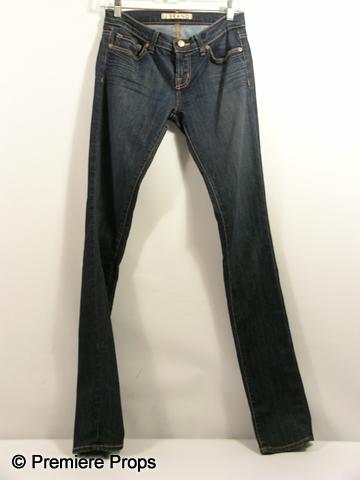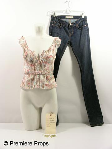 Easy A (2010) -Rhiannon (Alyson Michalka) screen worn, hero, beige with floral print, sleeveless cotton button front 'Guess' top, medium blue five pocket with a hole ripped in the leg 'J Brand' jeans, (size 26) and gold colored with beads hoop earrings. Includes wardrobe tag!